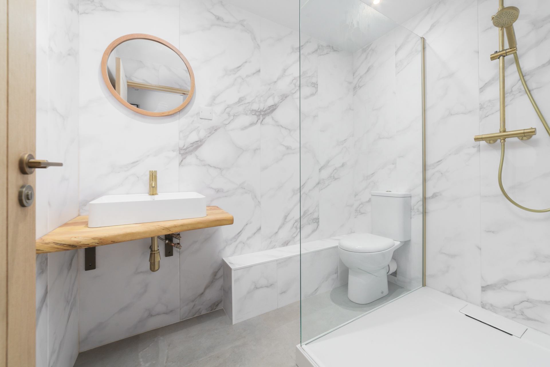 Bathroom: Walk-in shower, wash hand basin and WC.