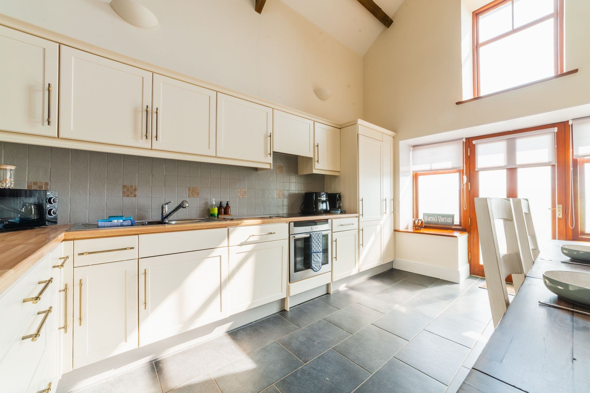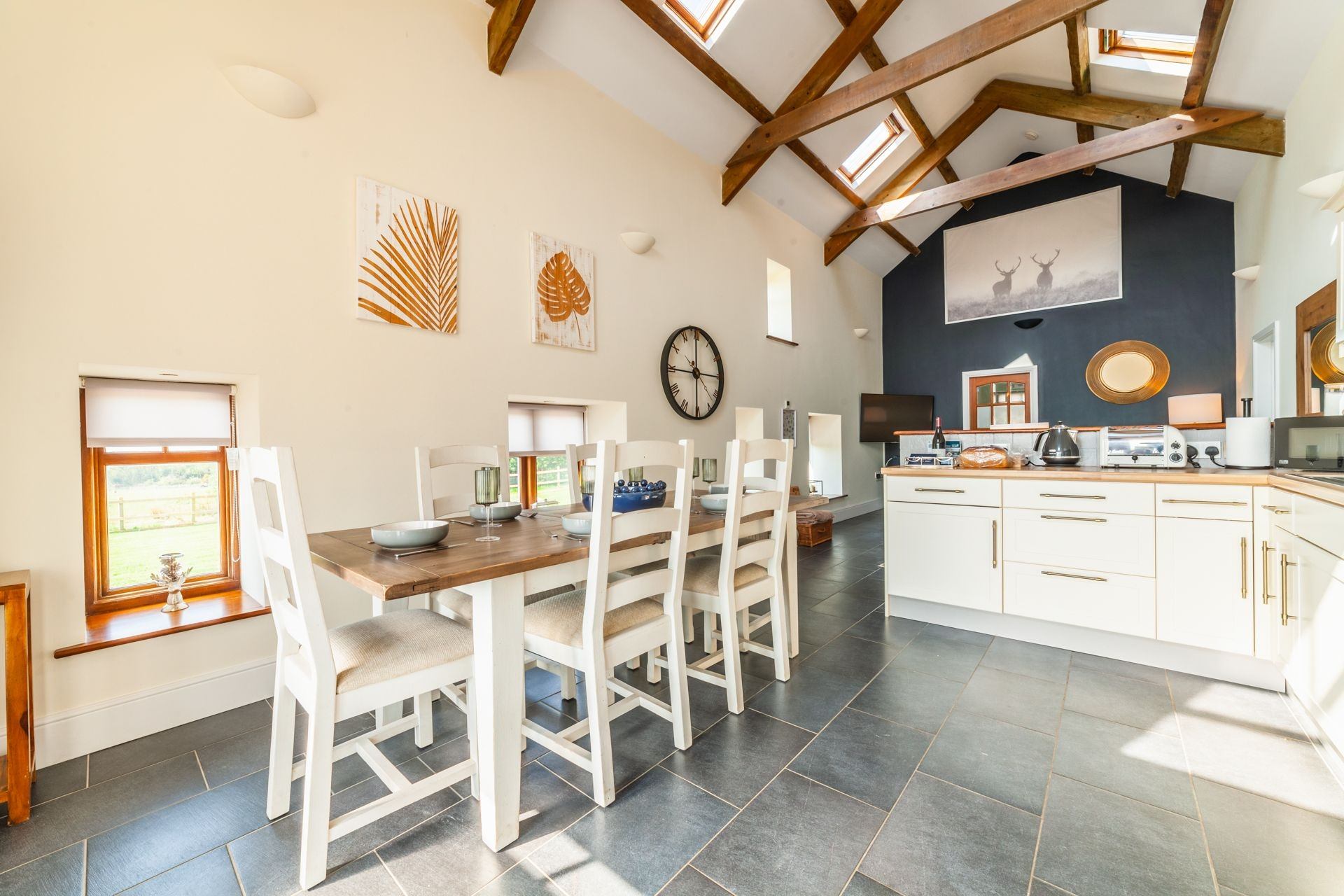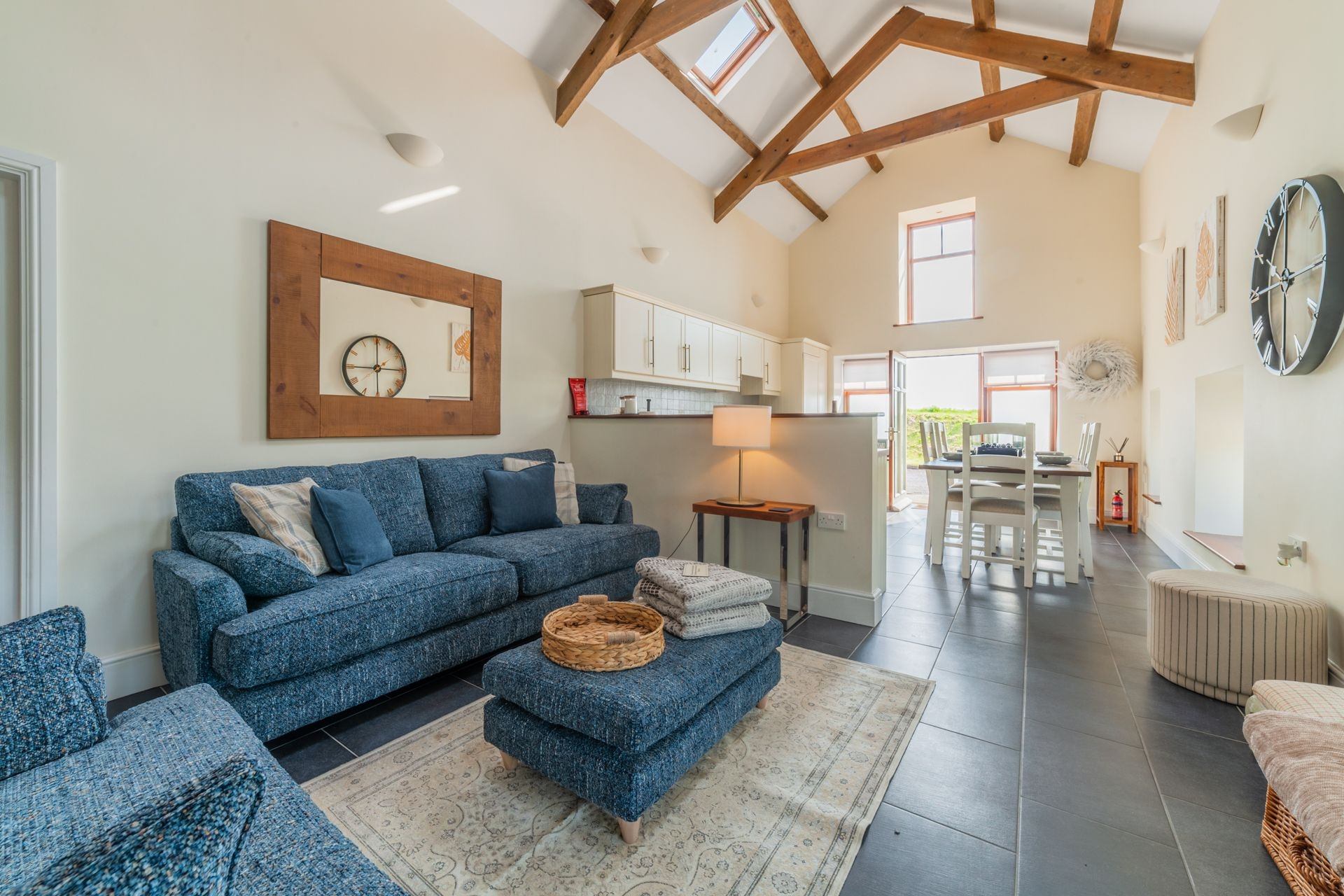 On entrance, guests are greeted by a spacious living area with a double-height ceiling stretching all of the way up to the exposed wooden beams in the loft space. Velux windows flood this area with natural light.