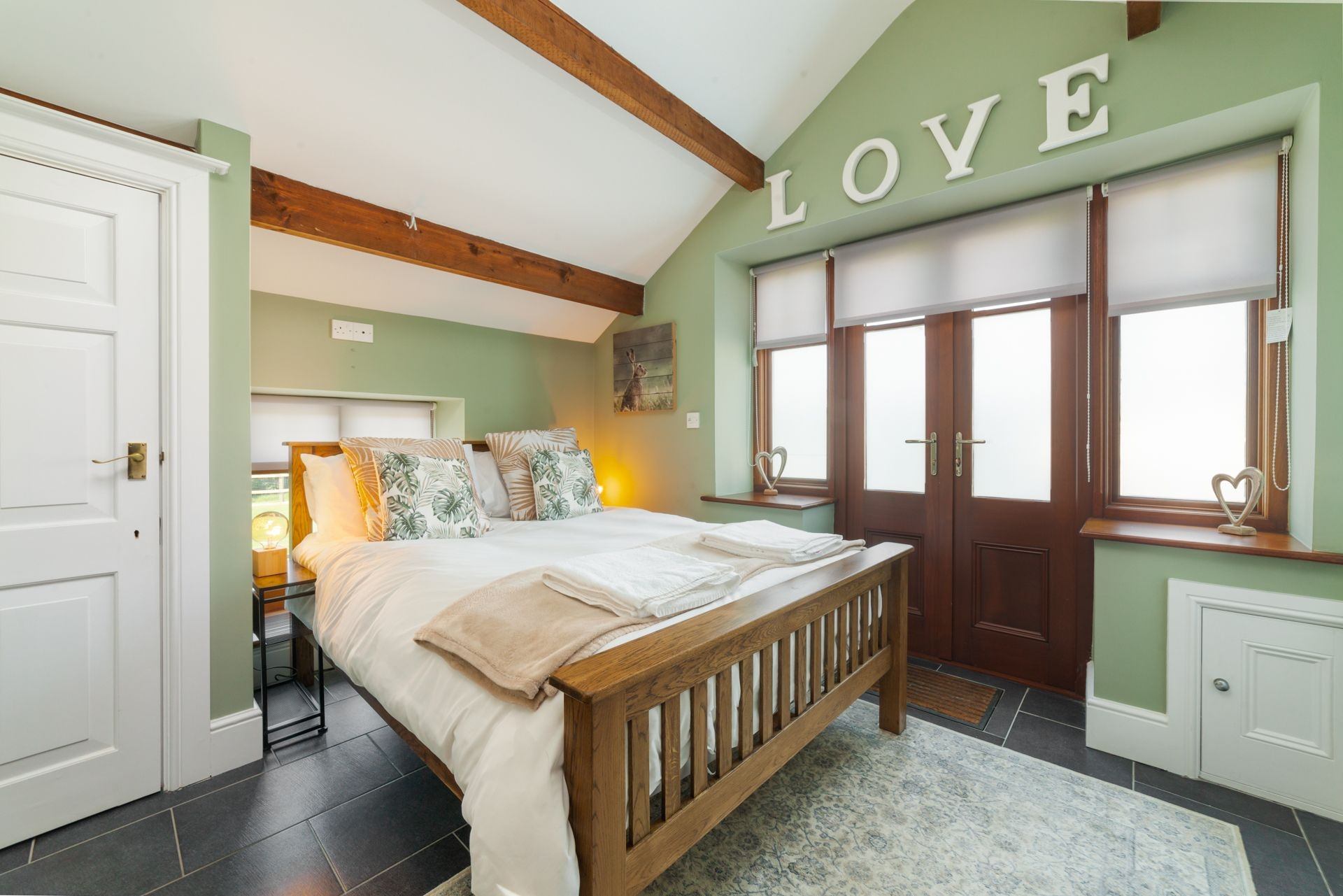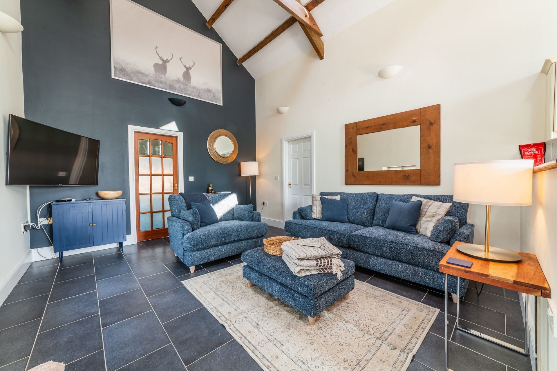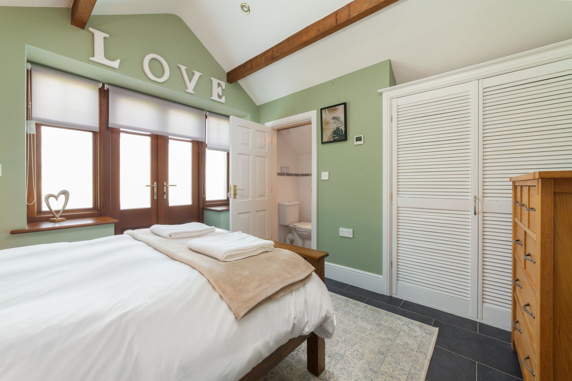 On entrance, guests are greeted by a spacious living area with a double-height ceiling stretching all of the way up to the exposed wooden beams in the loft space. Velux windows flood this area with natural light.