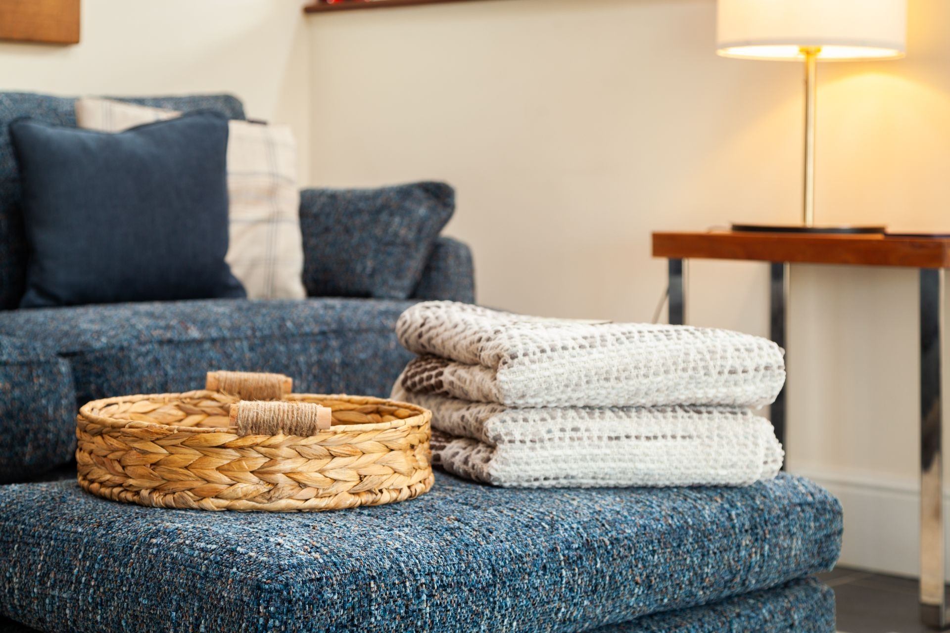 Living area: Comfortable 3 seater sofa, armchair, footstool and curved Smart TV.