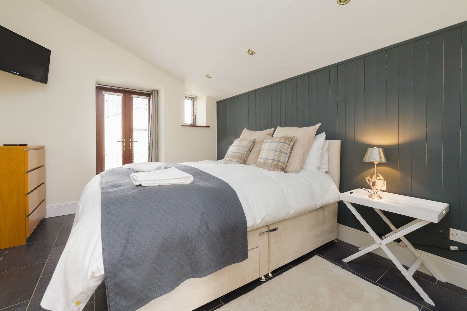 Bedroom: Super king bed, built-in wardrobe, bedside tables, chest of drawers, Smart TV.