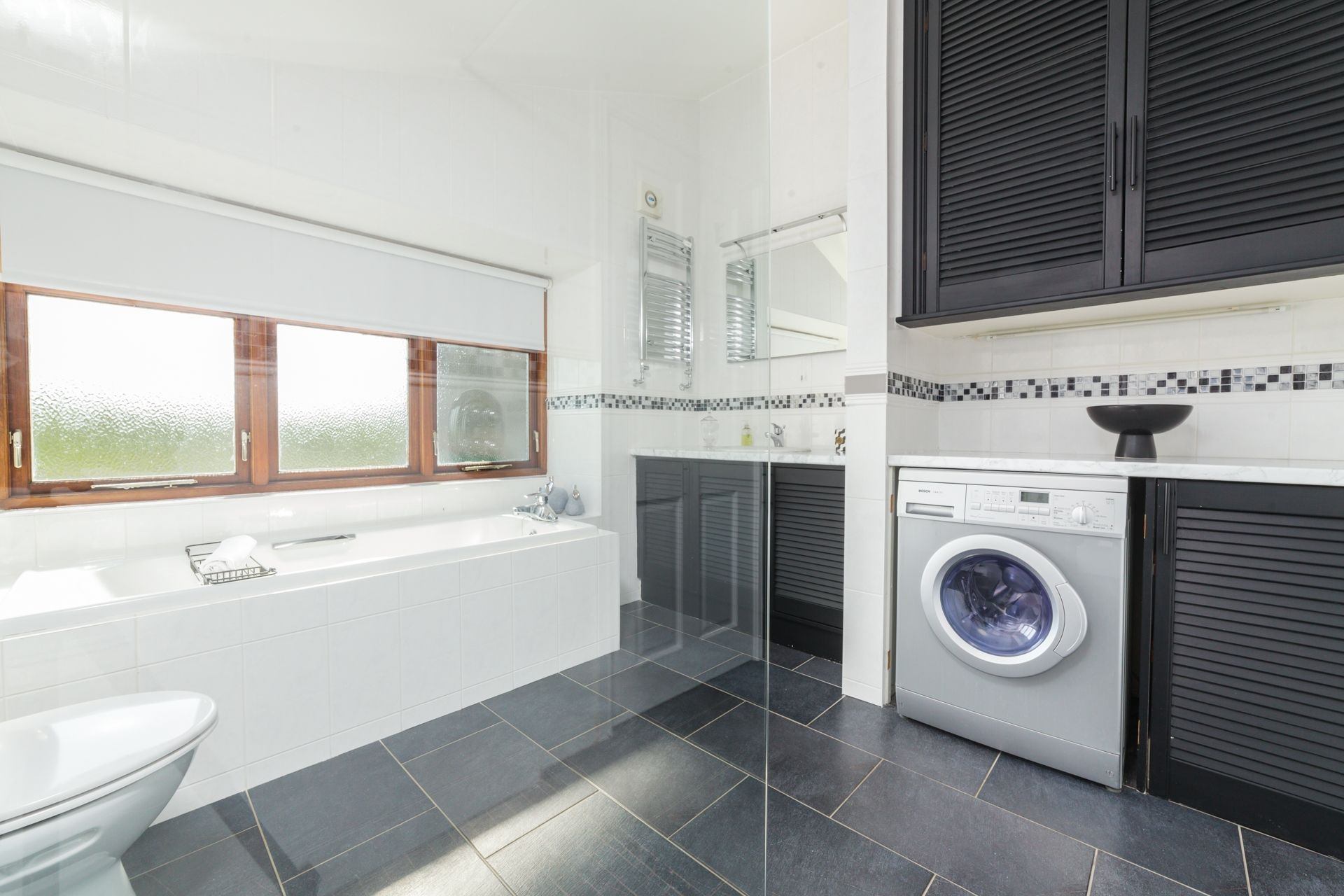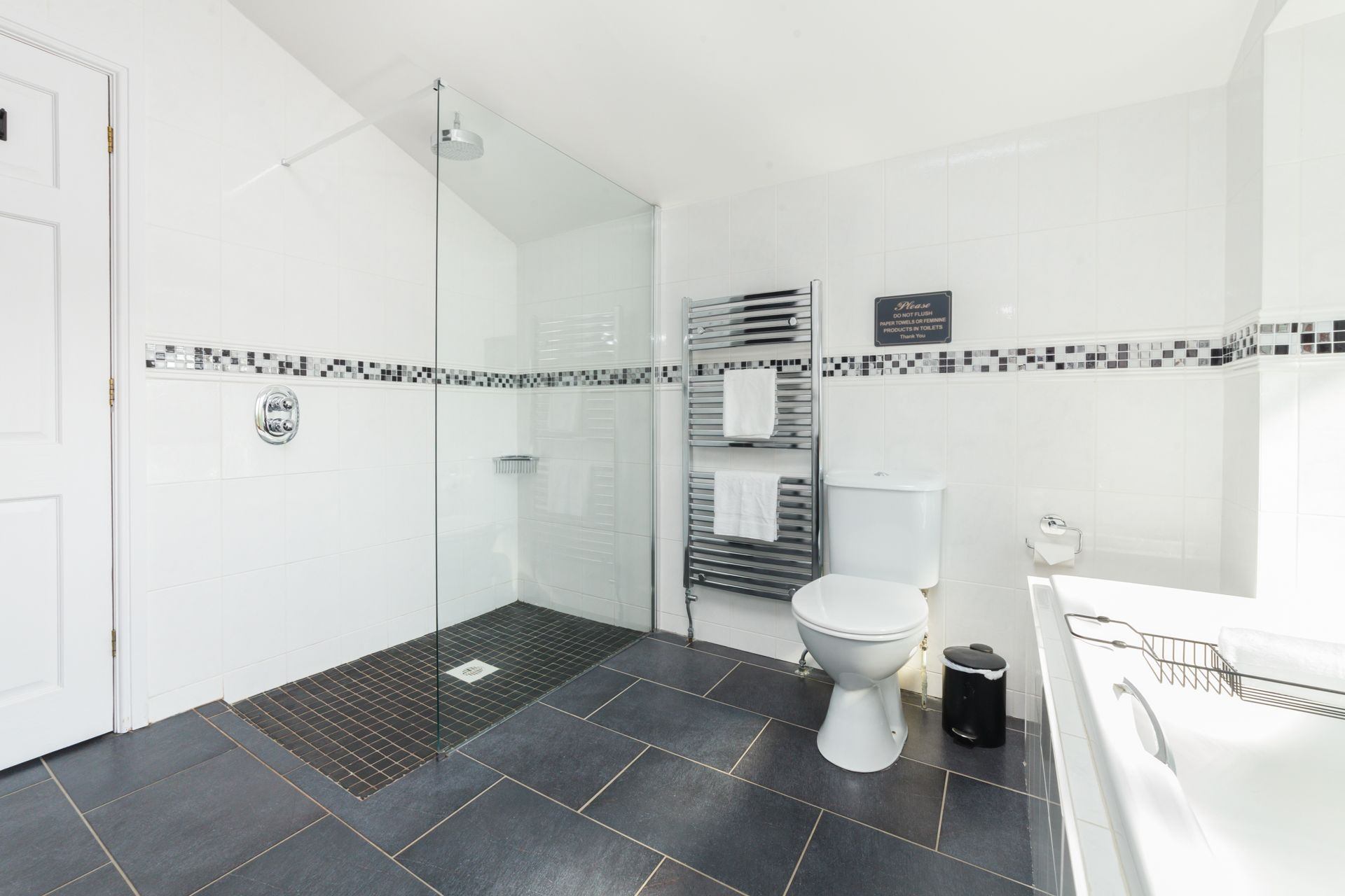 Bathroom: Shower, bath, WC and wash basin.