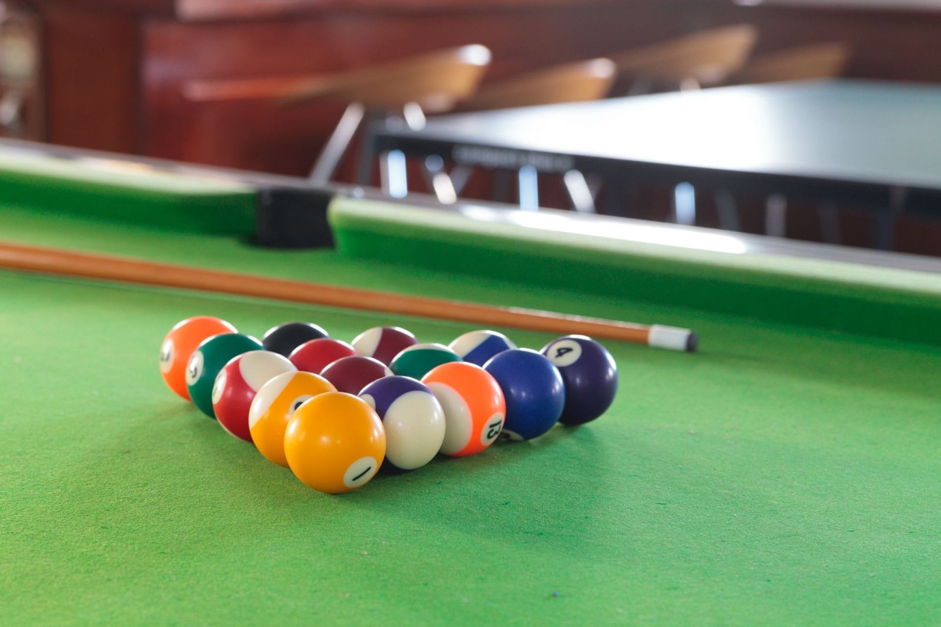 Lounge: Two sofas, chairs, TV, coffee table, electric fire, pool table, table-tennis table, bar.