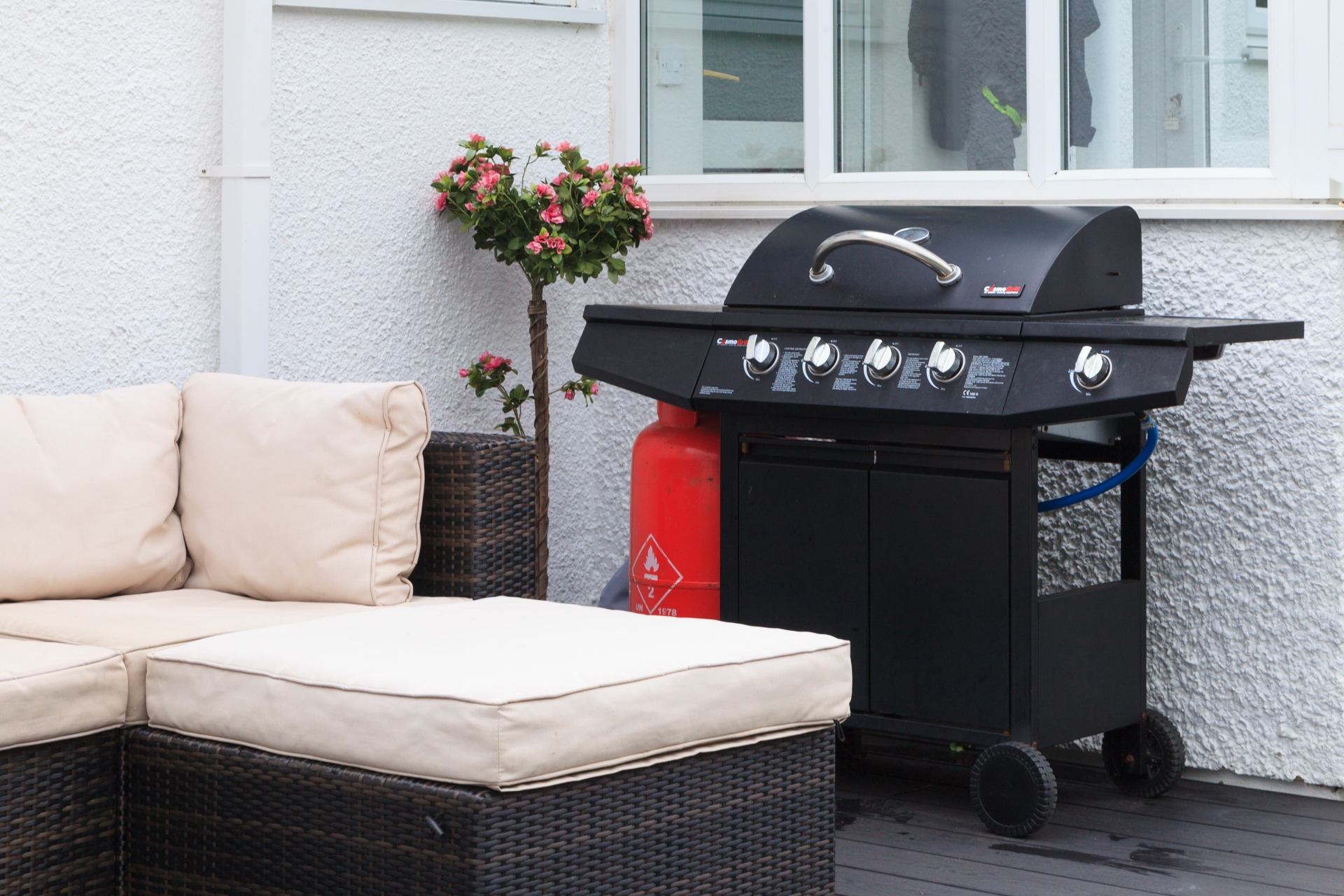 Outside, gardens to the front, side and rear offer plenty of space to relax, with a furnished patio, table and chairs, and BBQ for al fresco dining while taking in the views. The property also has a driveway with off-road parking and a double garage available for guest use.