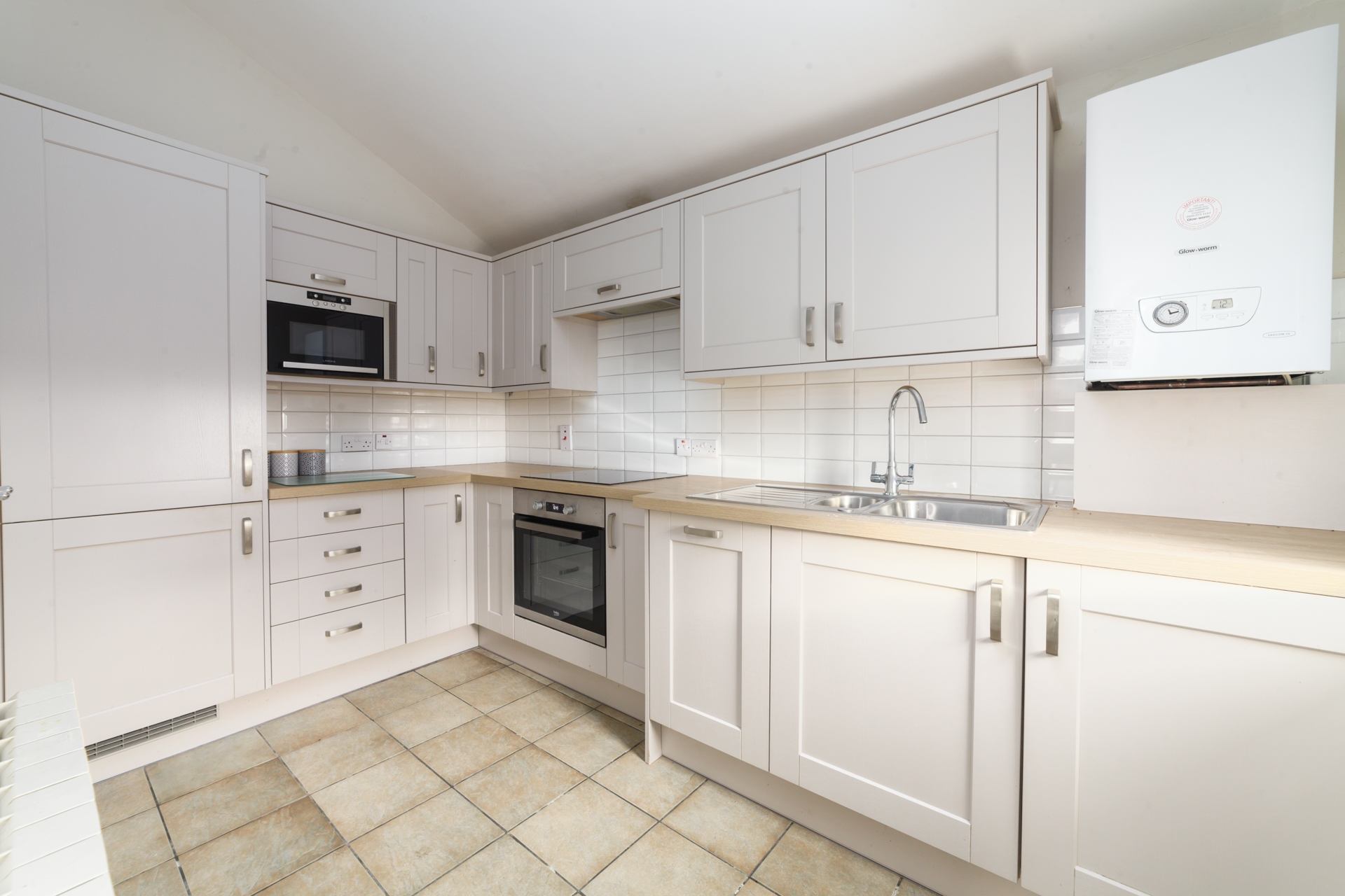 Kitchen: Well-equipped modern kitchen, containing hob, oven, fridge, freezer and microwave.