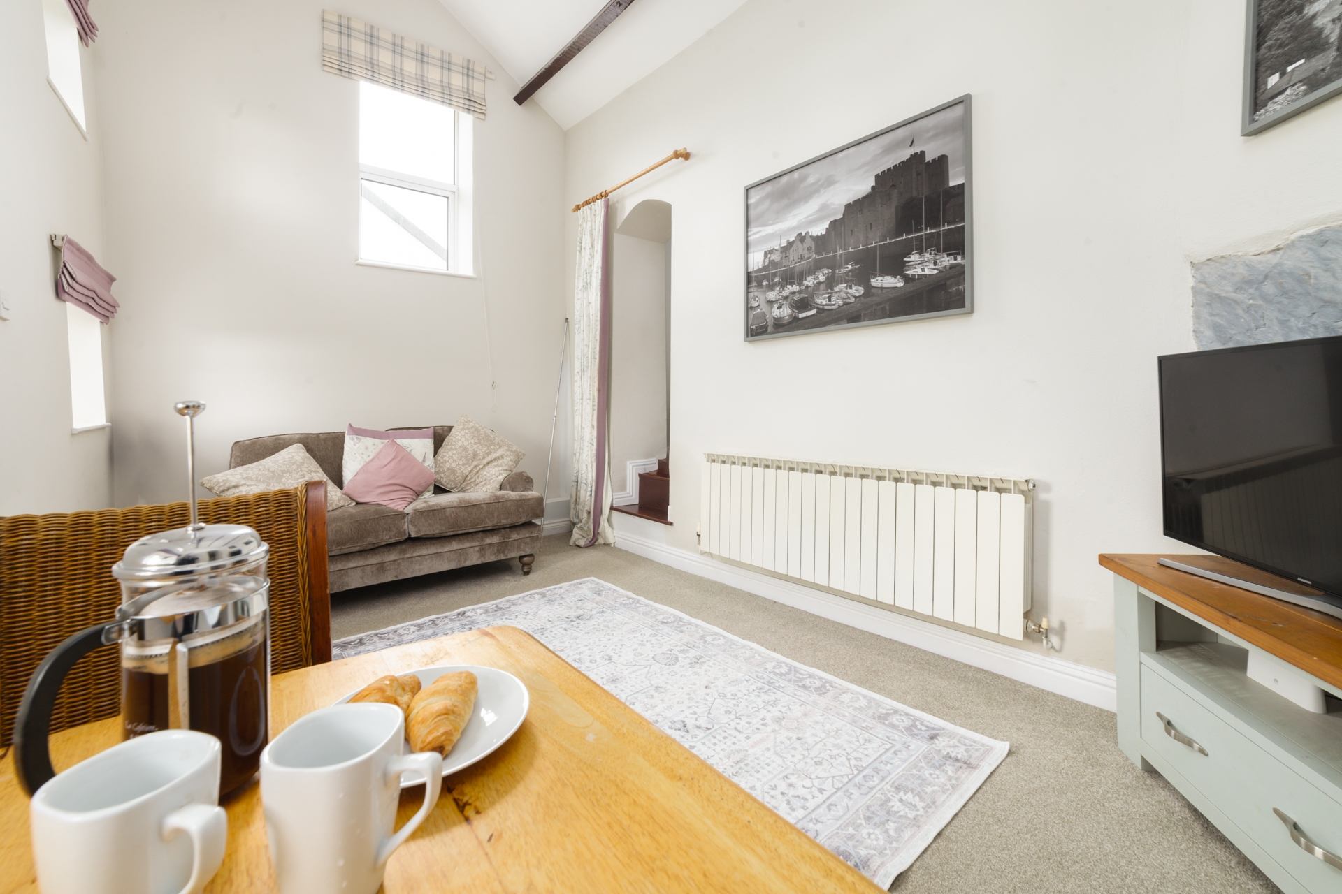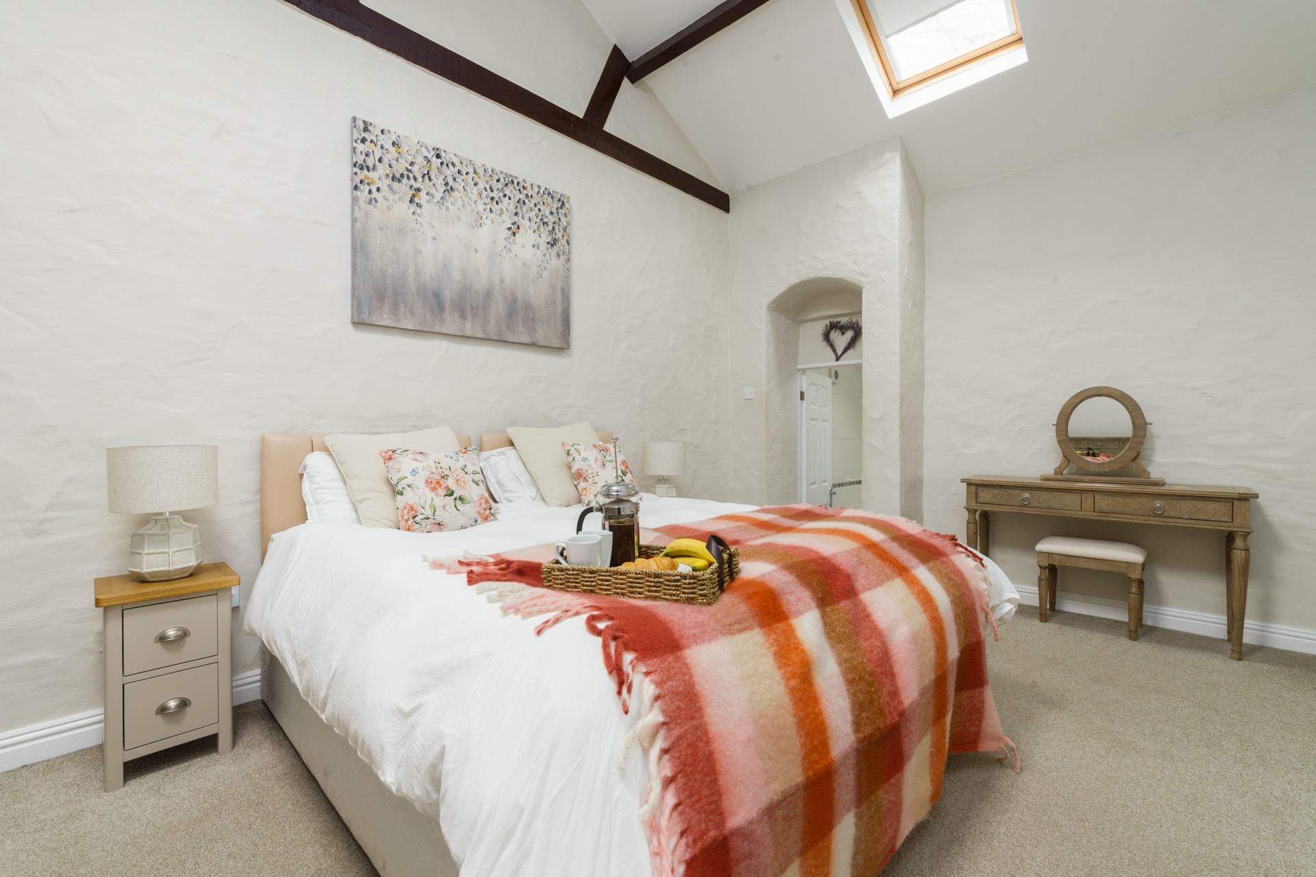 Inside, a generously sized bedroom with high ceilings features a super-king zip-and-link bed, which can be arranged as either a double or twin to suit your needs.
