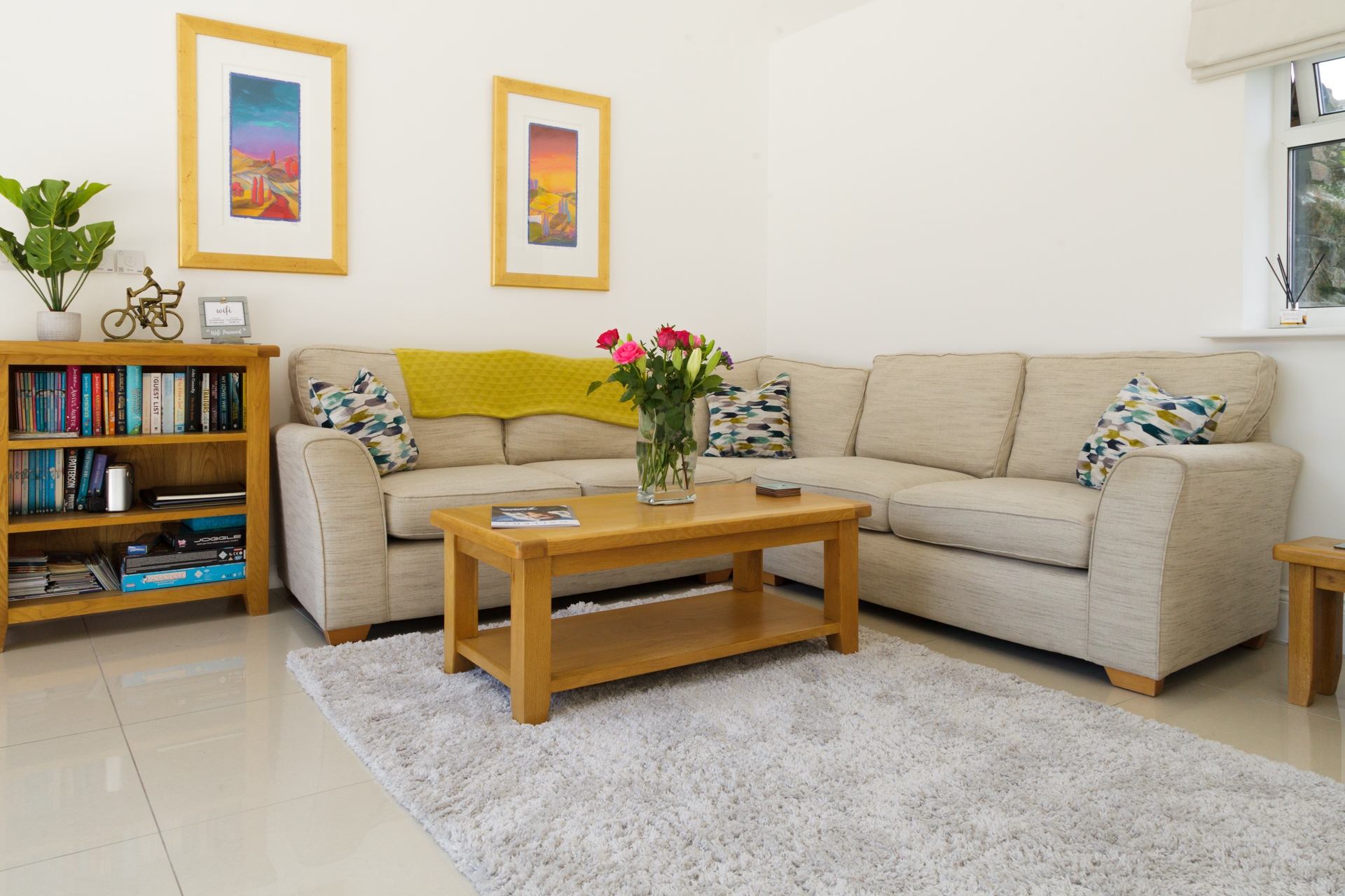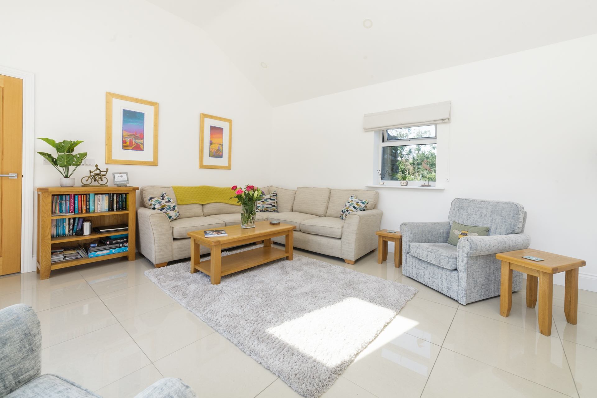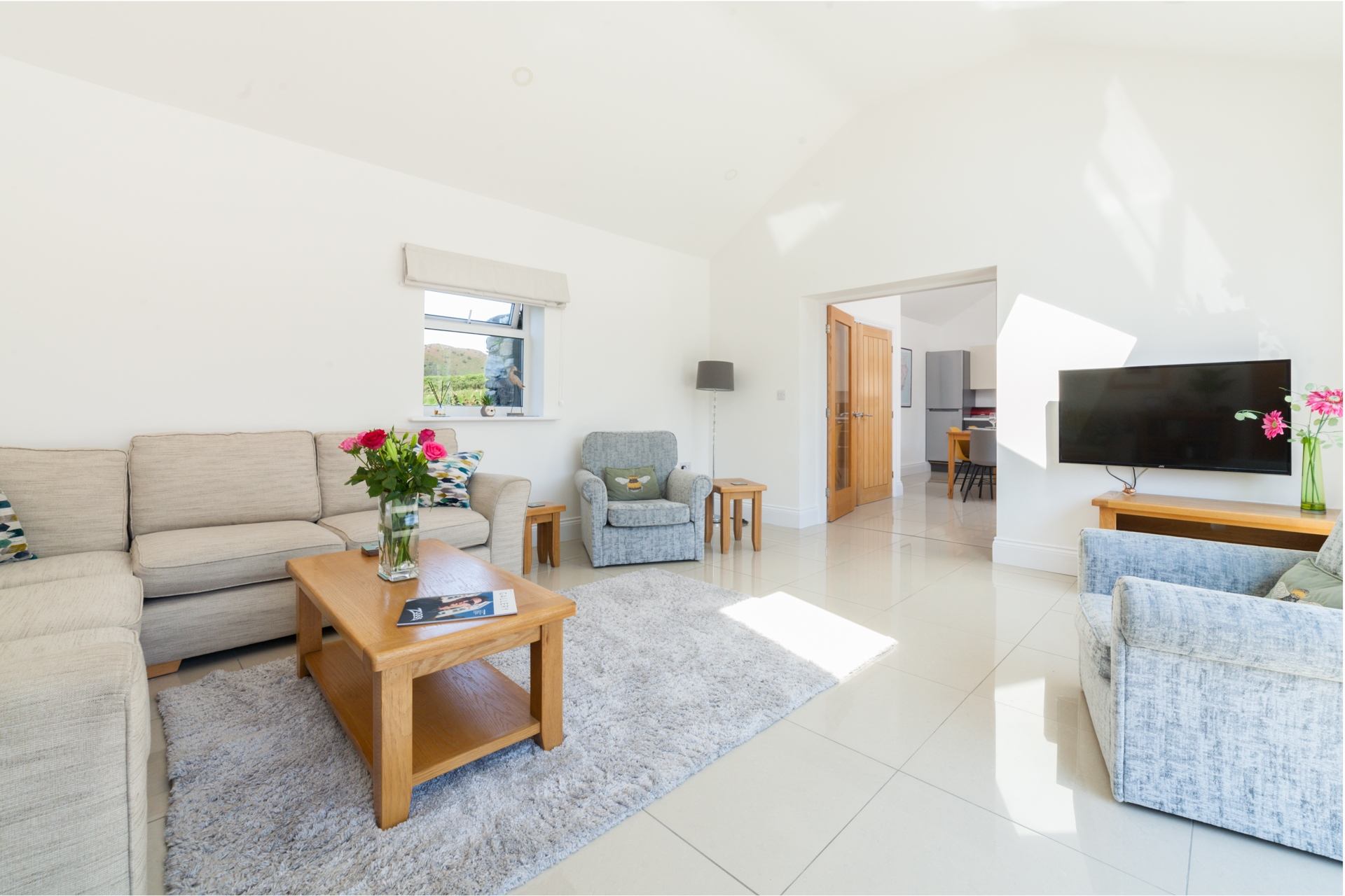 Living Room: Spacious corner sofa and additional armchairs, Smart TV, floor-to-ceiling windows, underfloor heating, electric blinds and quality oak furniture.