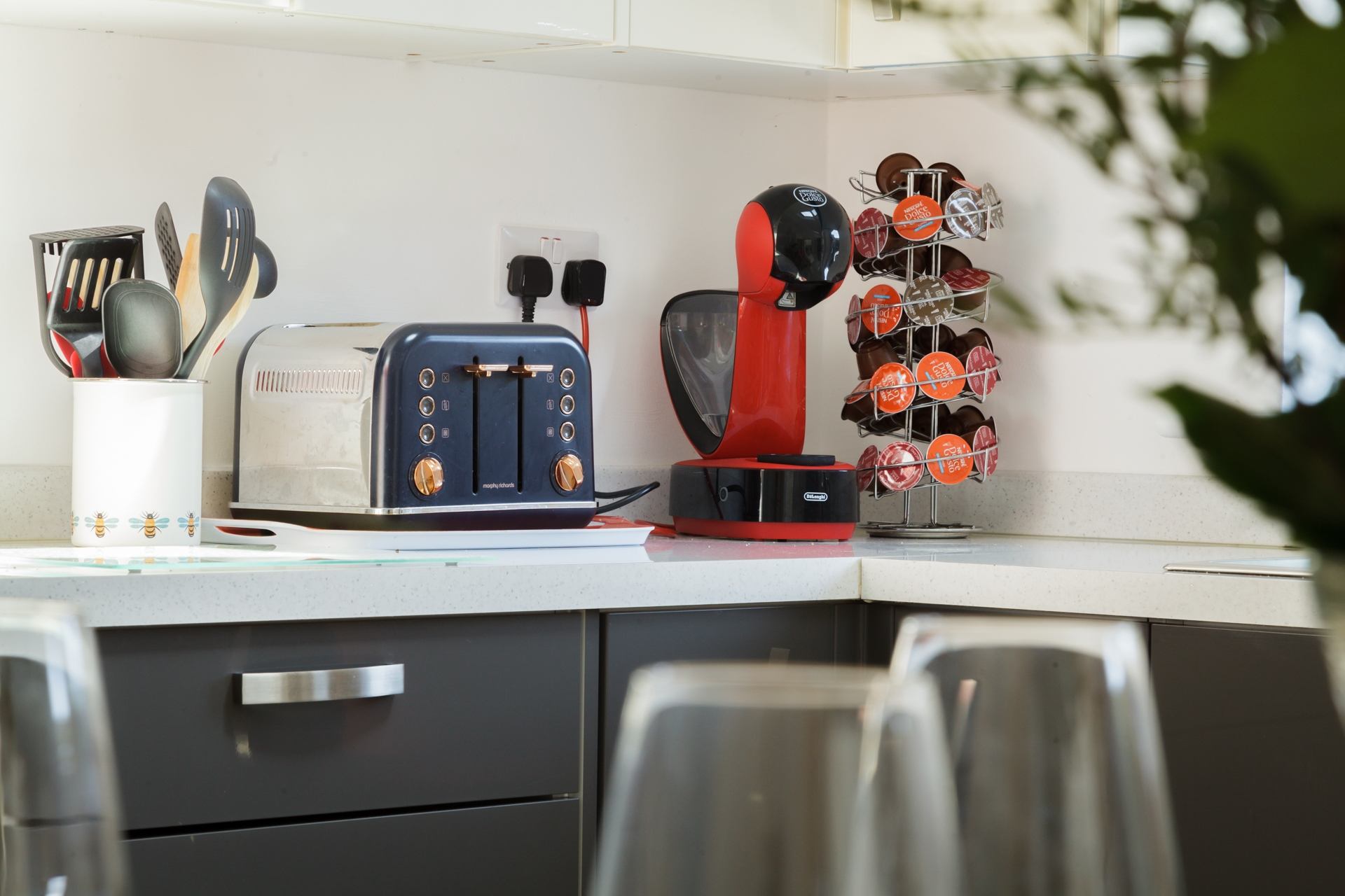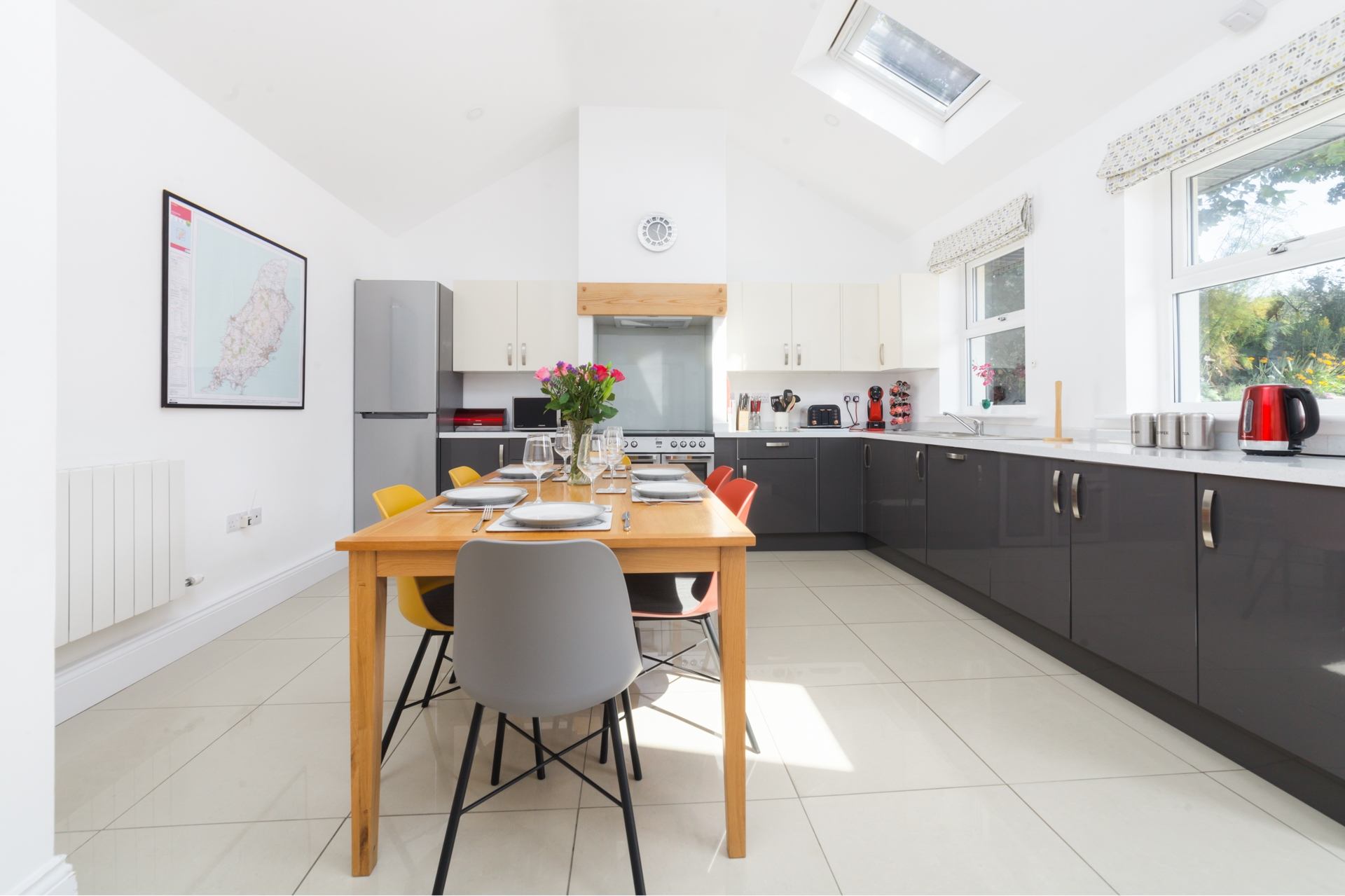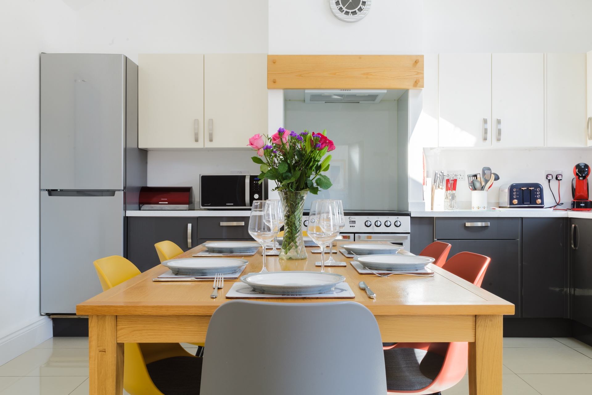 Kitchen & Dining Area: Modern high-gloss kitchen with electric range cooker, integrated dishwasher, fridge-freezer, microwave, washing machine and separate tumble dryer. Equipped with Denby crockery, quality cutlery and kitchen essentials. Dolce Gusto pod coffee machine provided. Dining area seats 6.
