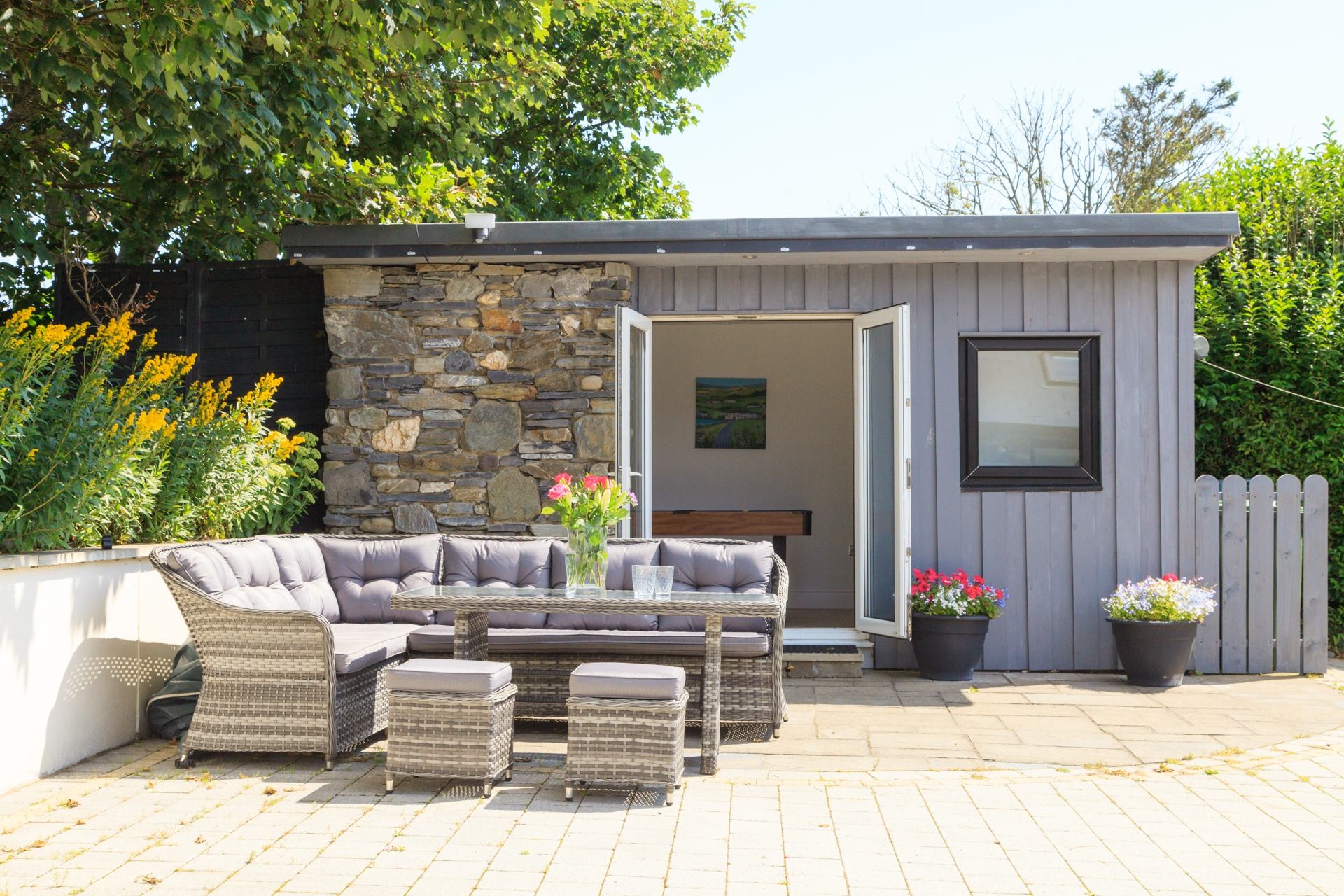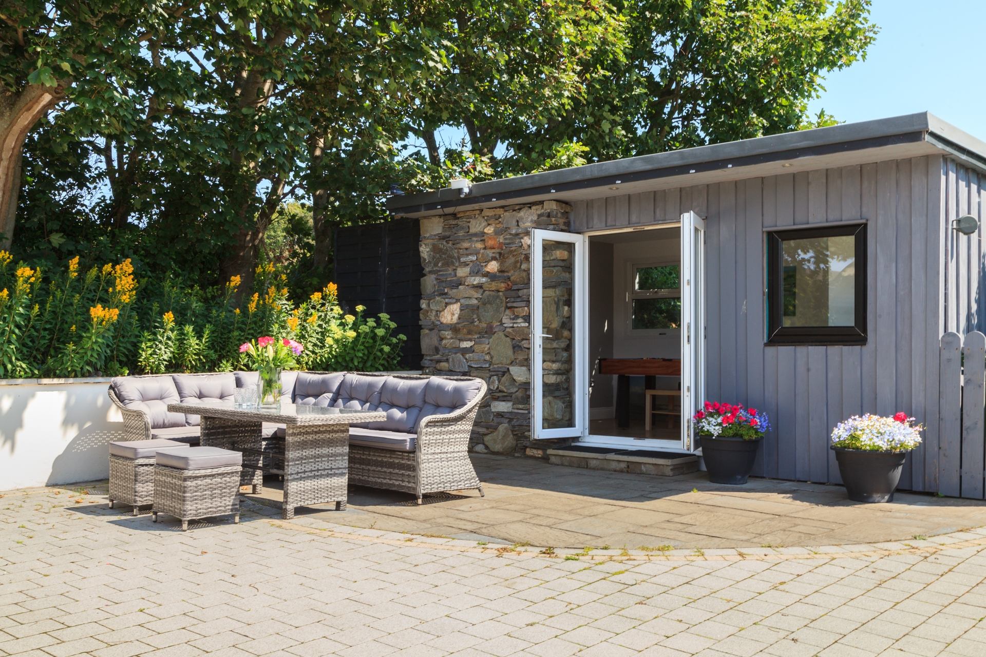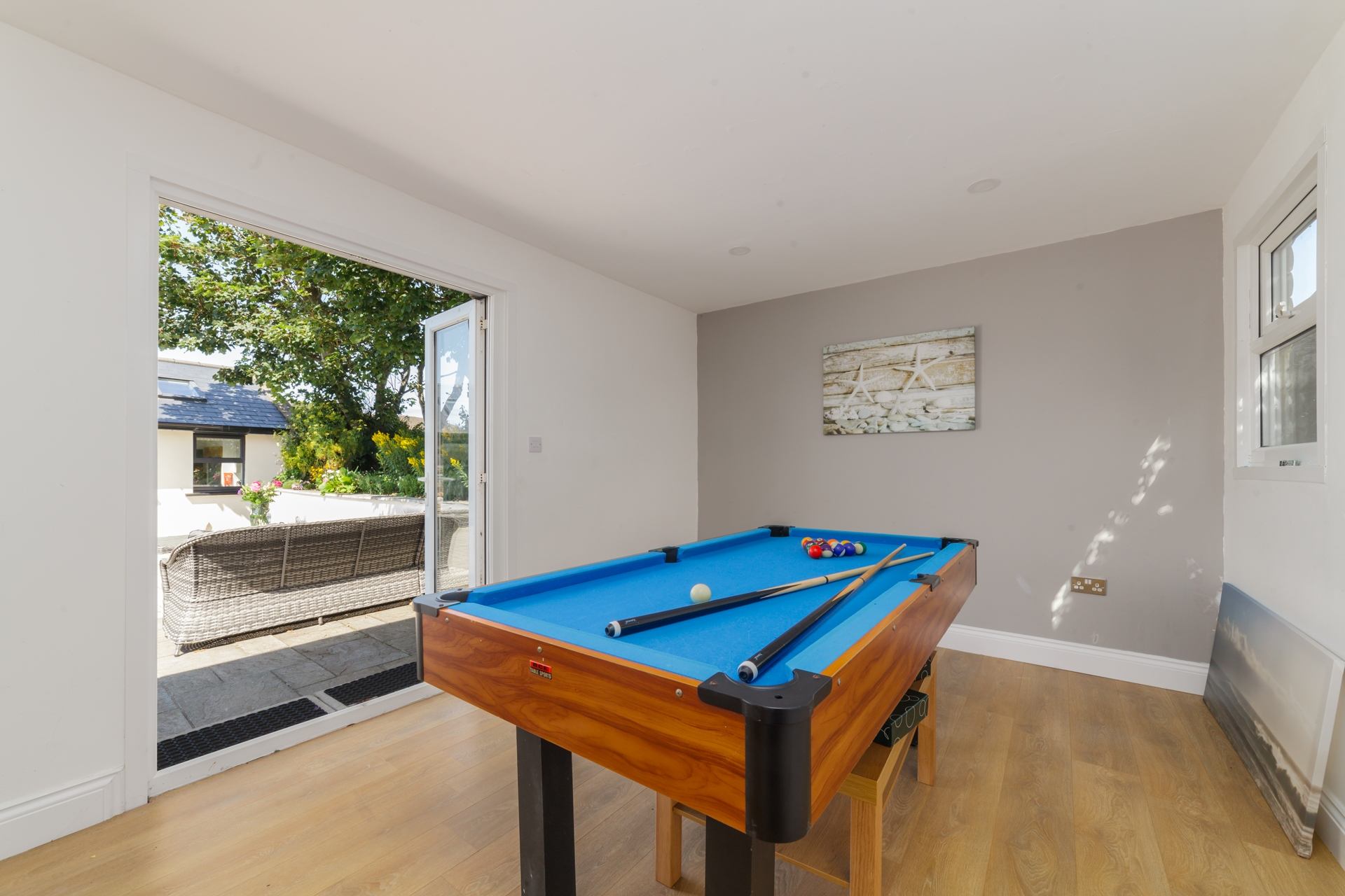 Outdoor: Private patio area with table and chairs, a suntrap in the evenings. Separate detached garden room with pool table, beach games and equipment. Secure gated driveway with ample private parking.