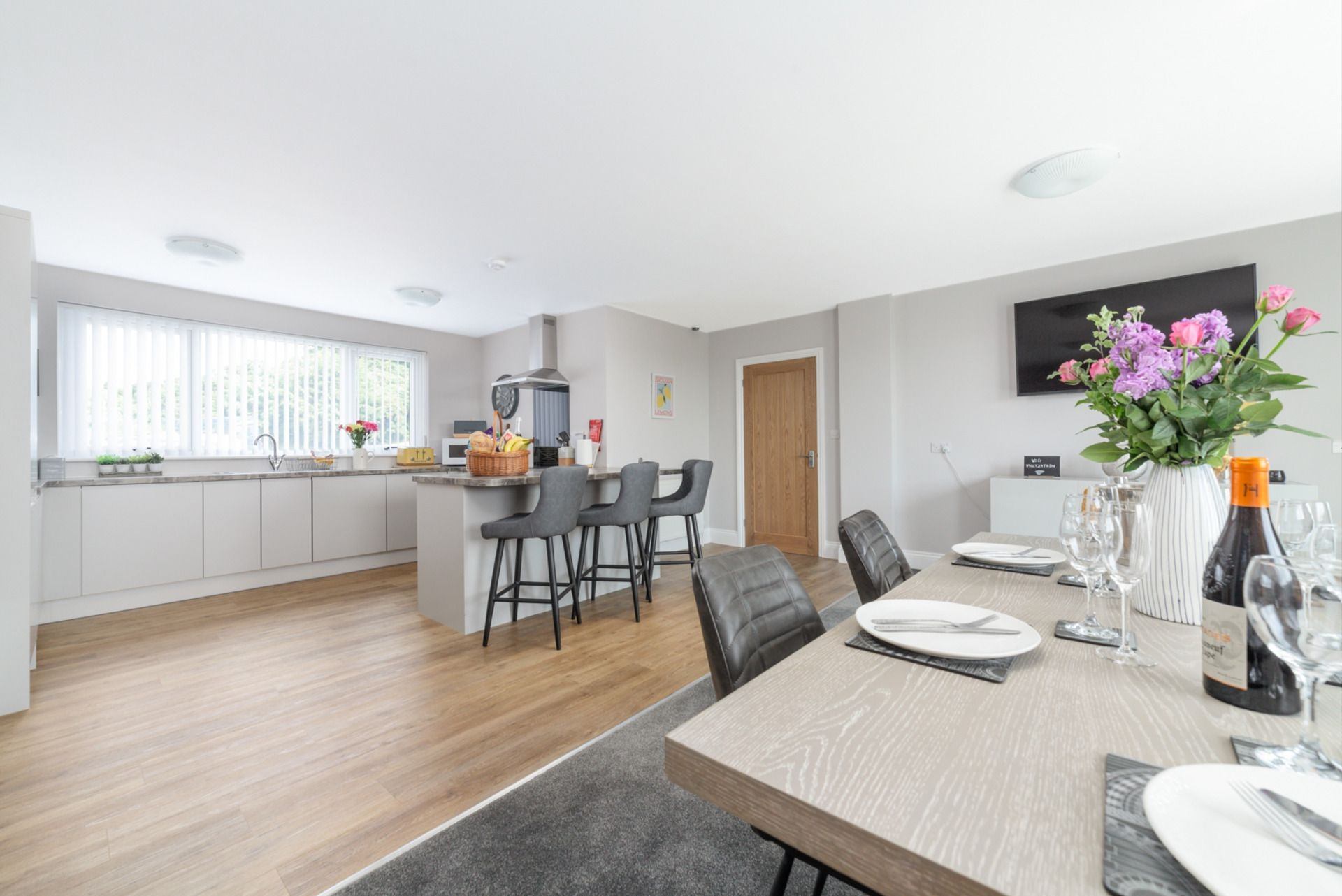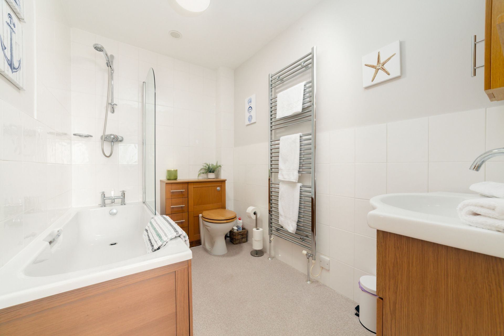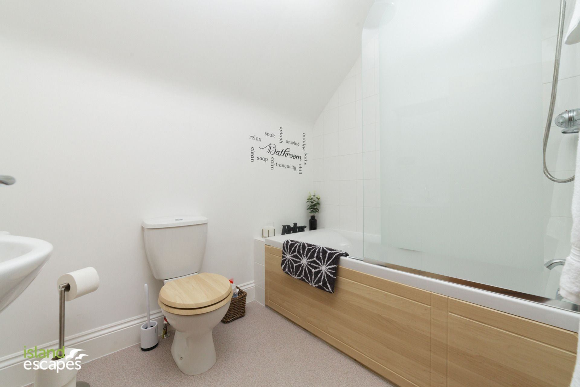 Kitchen: Well-equipped containing oven, hob, toaster, air fryer, kettle, dishwasher, fridge/freezer, breakfast bar with 3 stools and Bluetooth speaker.