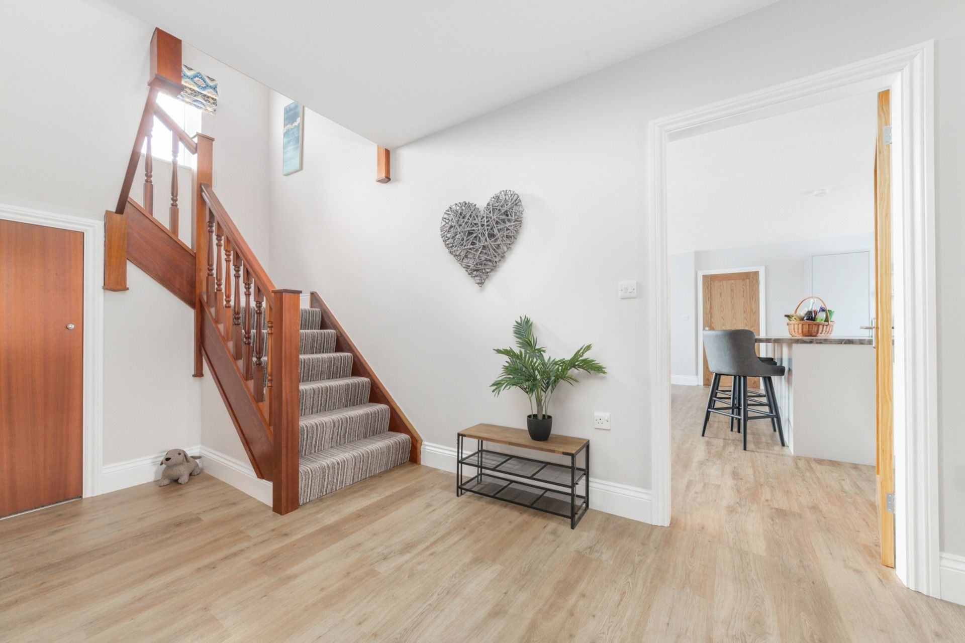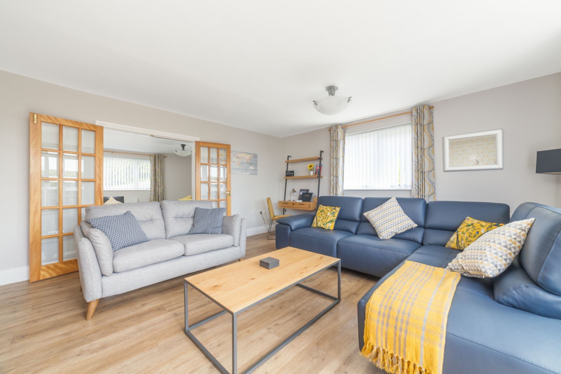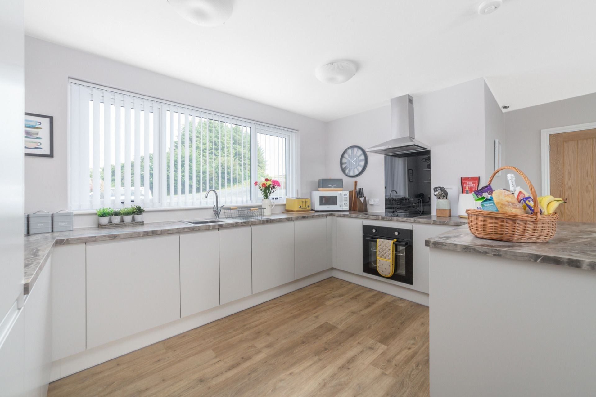 Kitchen: Well-equipped containing oven, hob, toaster, air fryer, kettle, dishwasher, fridge/freezer, breakfast bar with 3 stools and Bluetooth speaker.