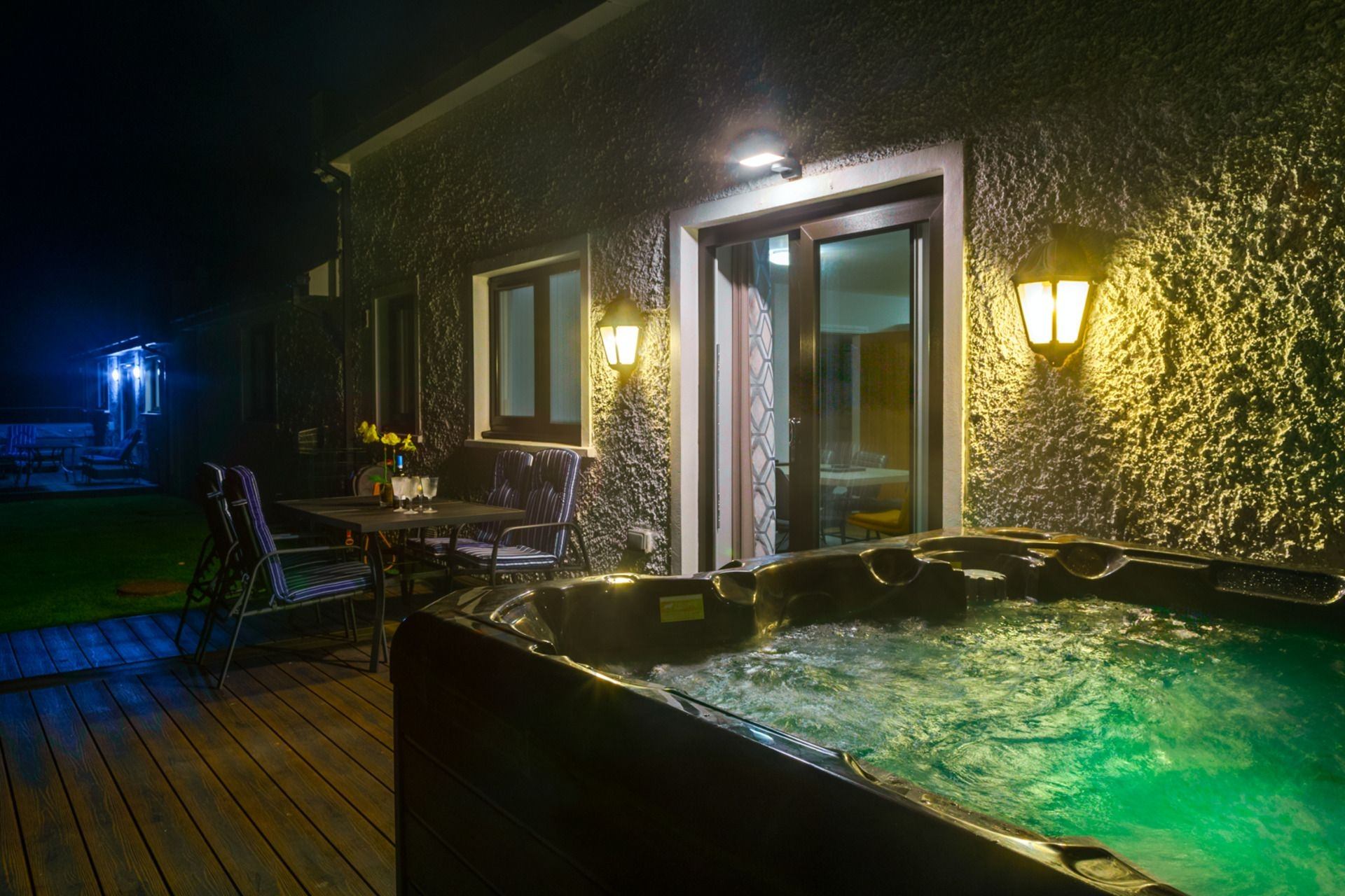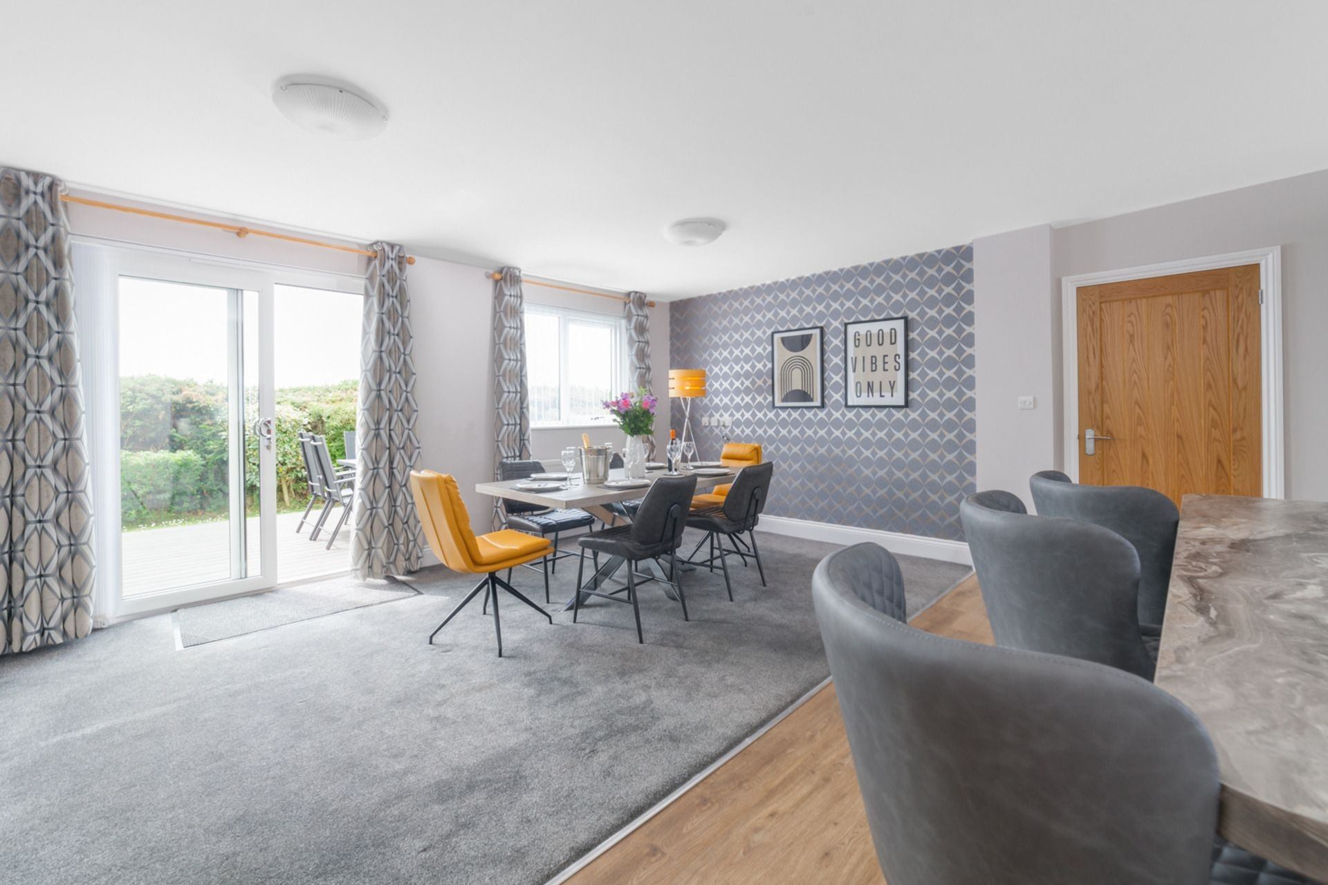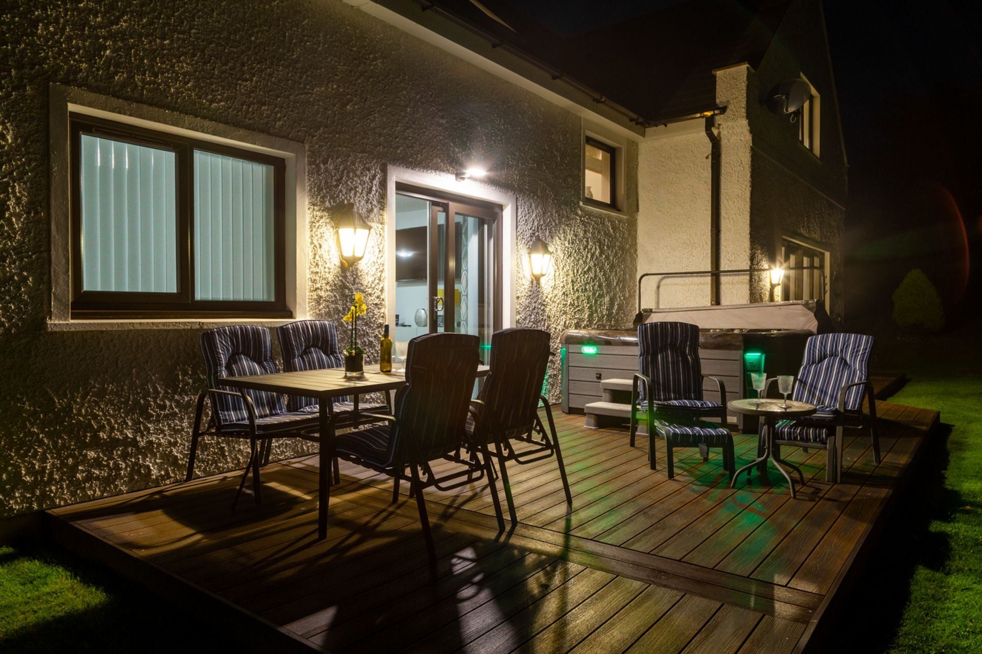 Outdoor: Decking area with table and chairs, accessed via French doors. Enjoy the hot tub for up to six people, available to add to your stay for£10 per day.