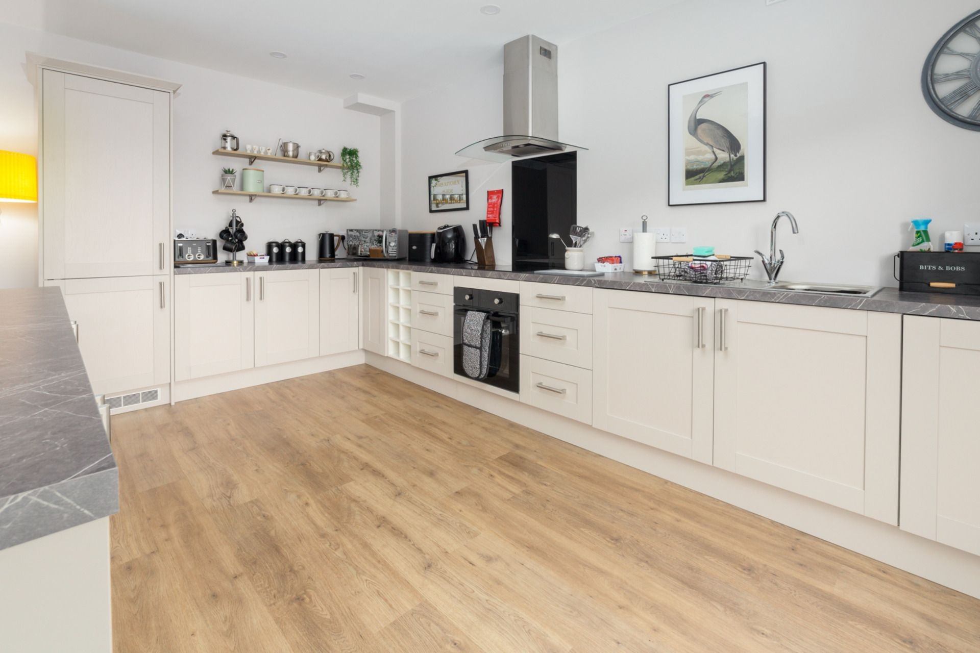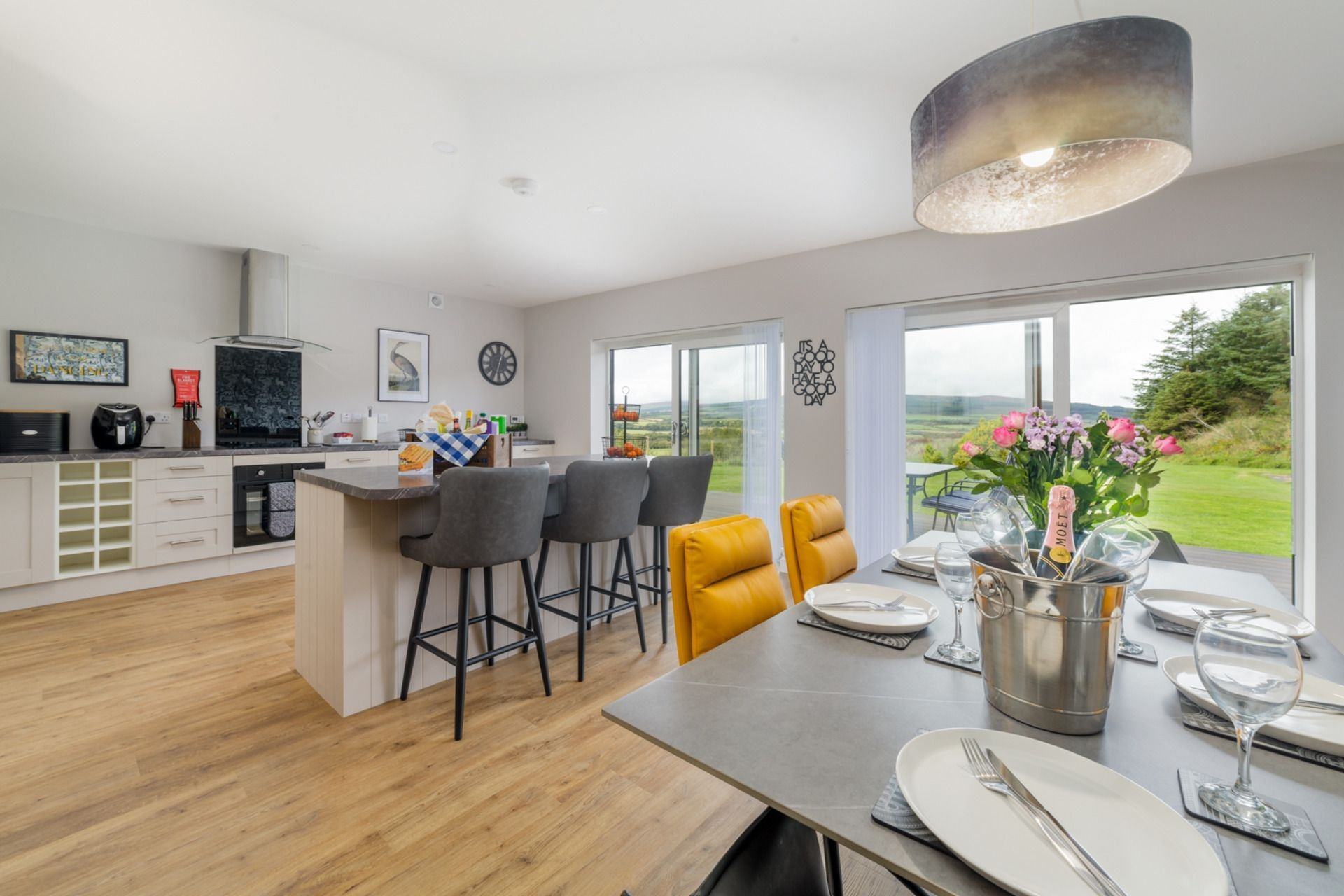 Kitchen: Well-equipped containing oven, hob, toaster, air fryer, kettle, washer/dryer, dishwasher, fridge/freezer, breakfast bar with 3 stools, Bluetooth speaker and access to decking area