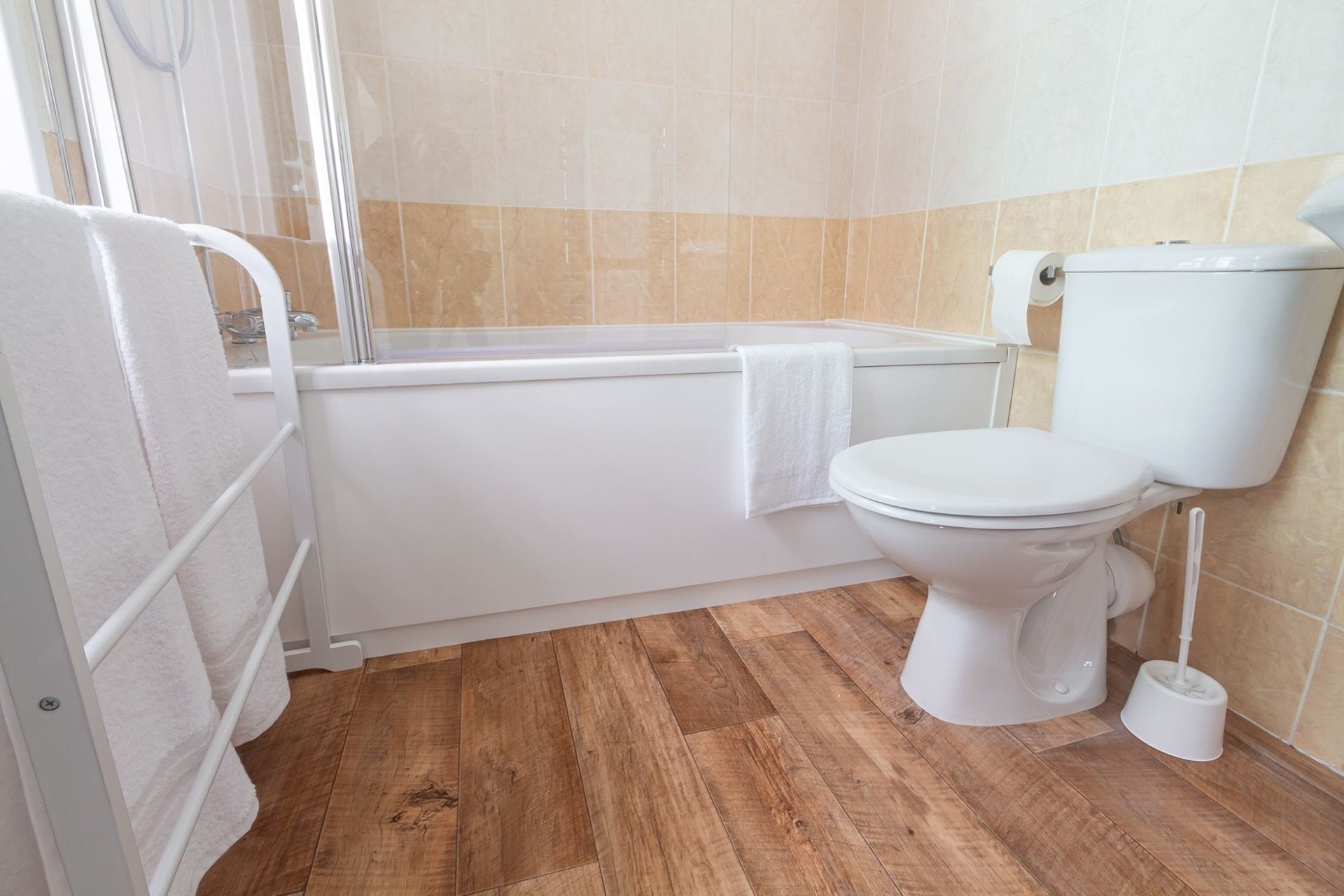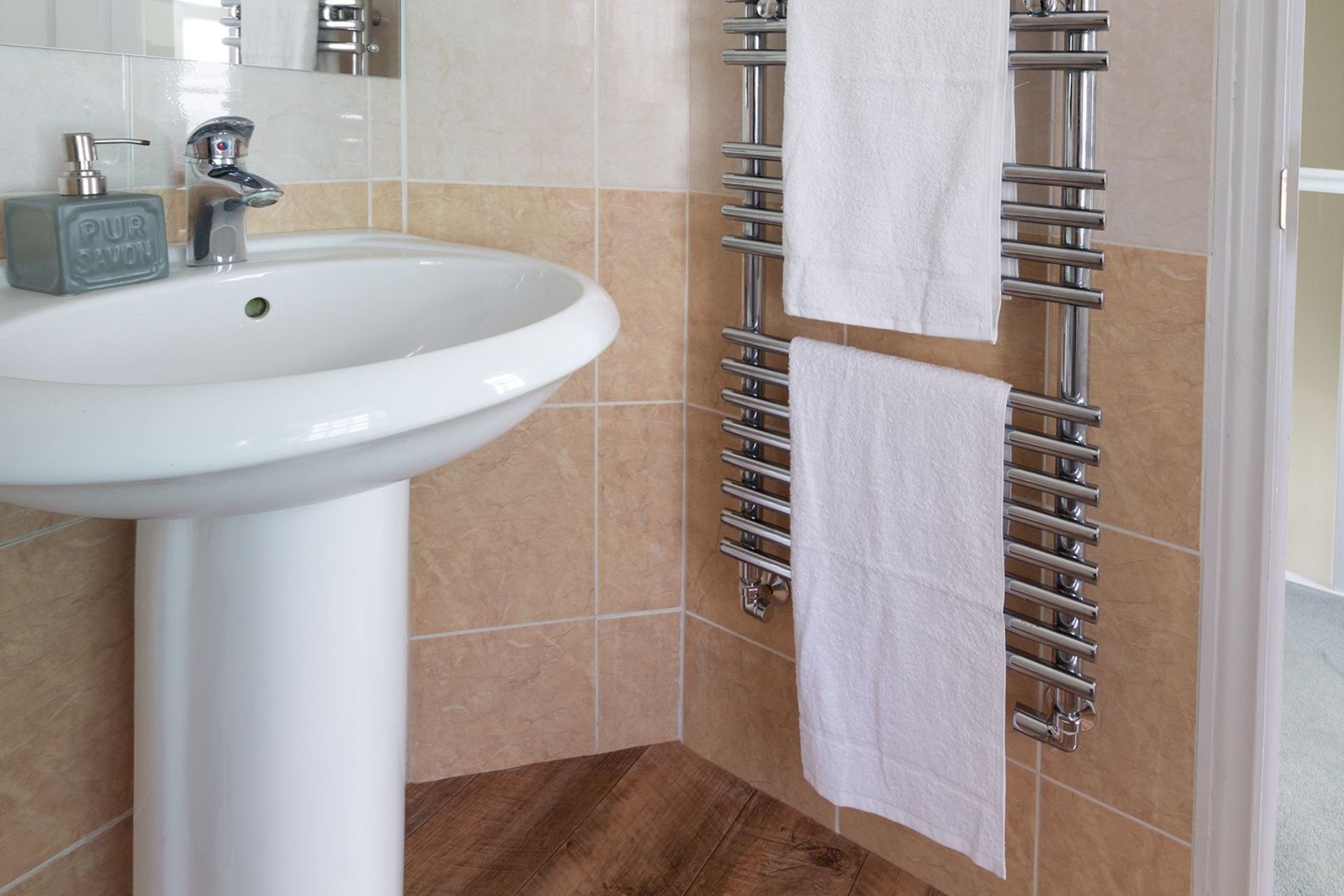 Family Bathroom: Bath with shower over, WC, wash hand basin and heated towel rail.