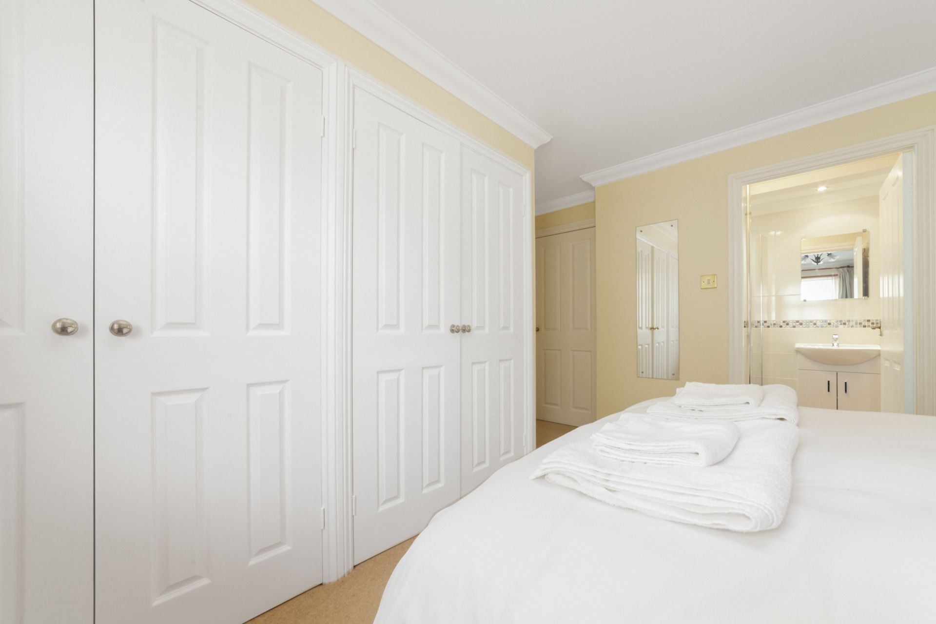 Bedroom 1: King size double bed, built in wardrobe with TV and chest of drawers inside and bedside tables.