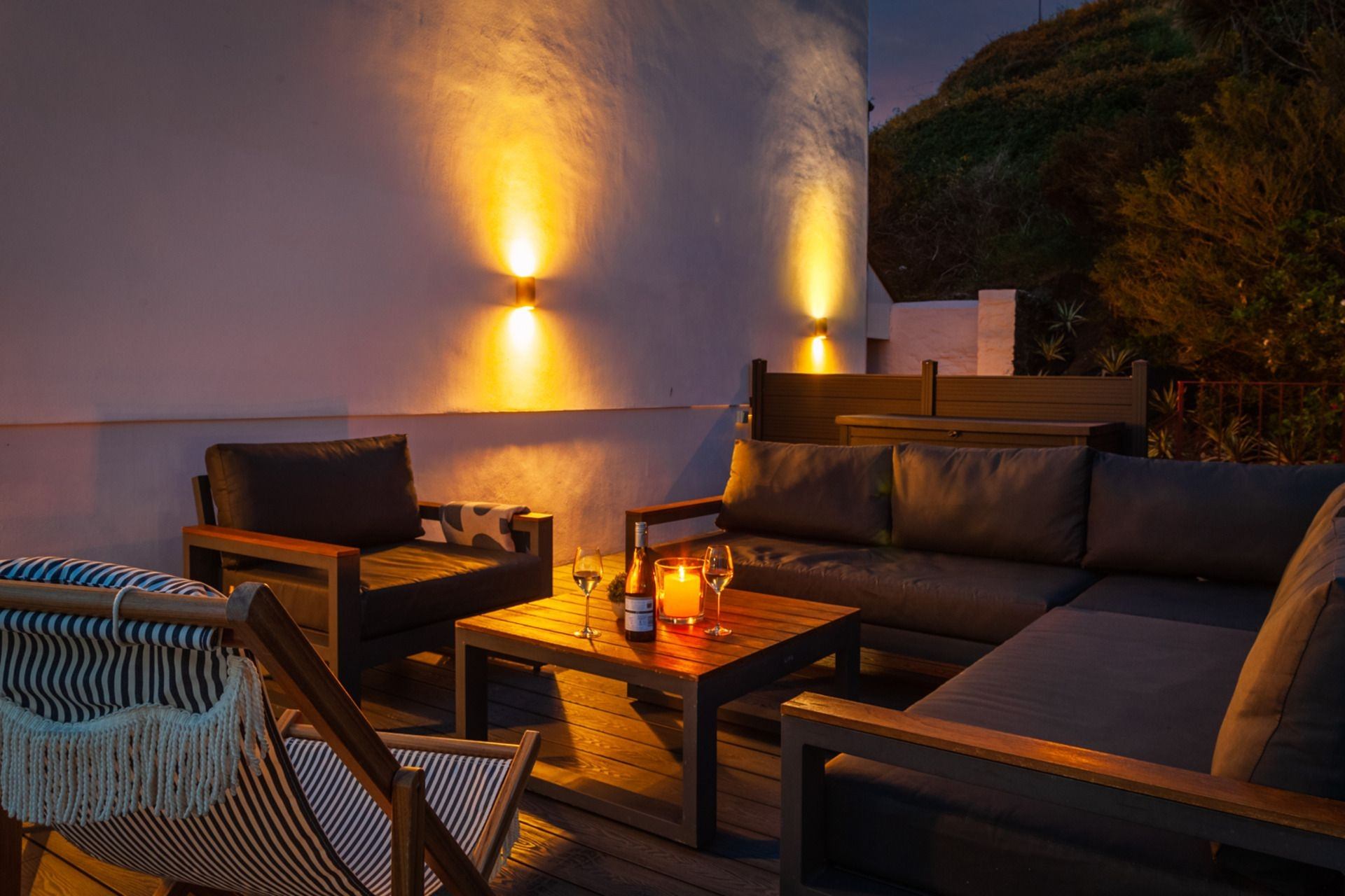 Living room: 4 stylish chairs, plush L-shaped sofa and Smart TV, featuring sea views.