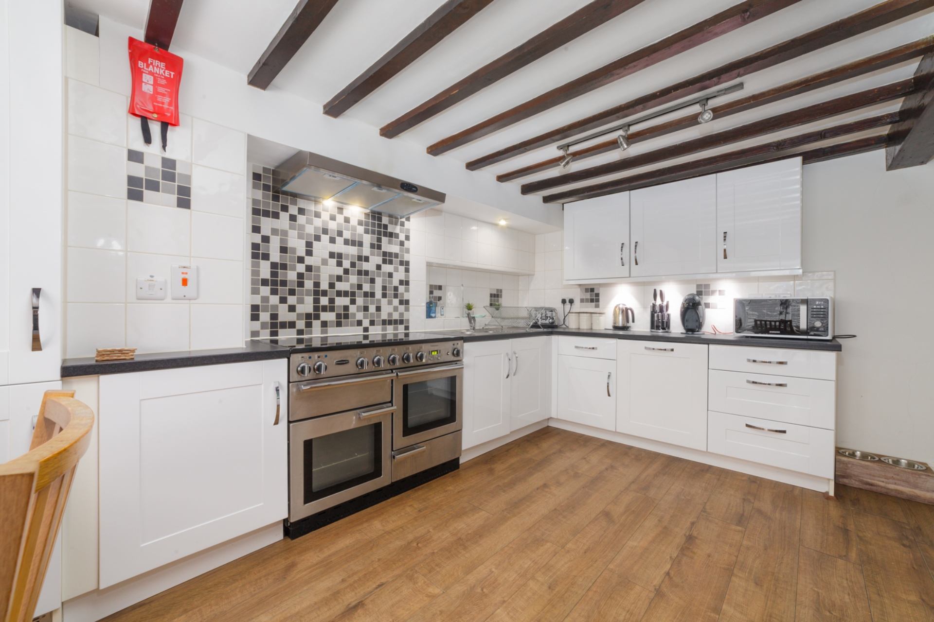 Kitchen & Dining Area: Well-equipped kitchen, featuring Range cooker, dishwasher, microwave, toaster & coffee machine. Dining area contains table and seating for 6 people.