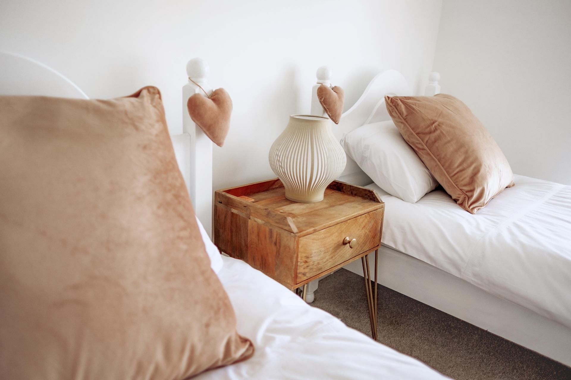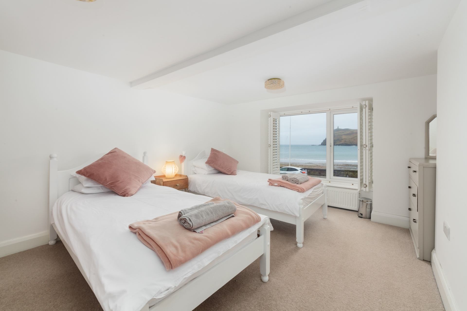 Bedroom 2: Twin beds, bedside tables, walk-in wardrobe area, chest of drawers, sea views.