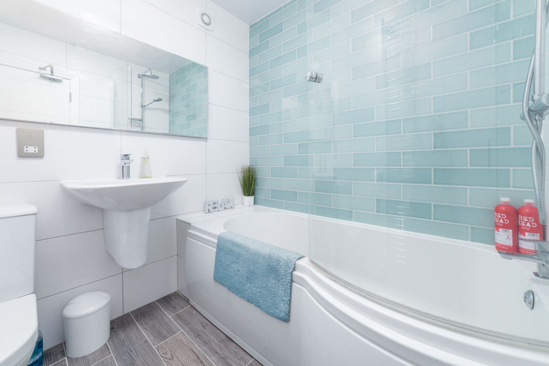 Bathroom: Bath with shower, WC and wash hand basin with vanity unit.