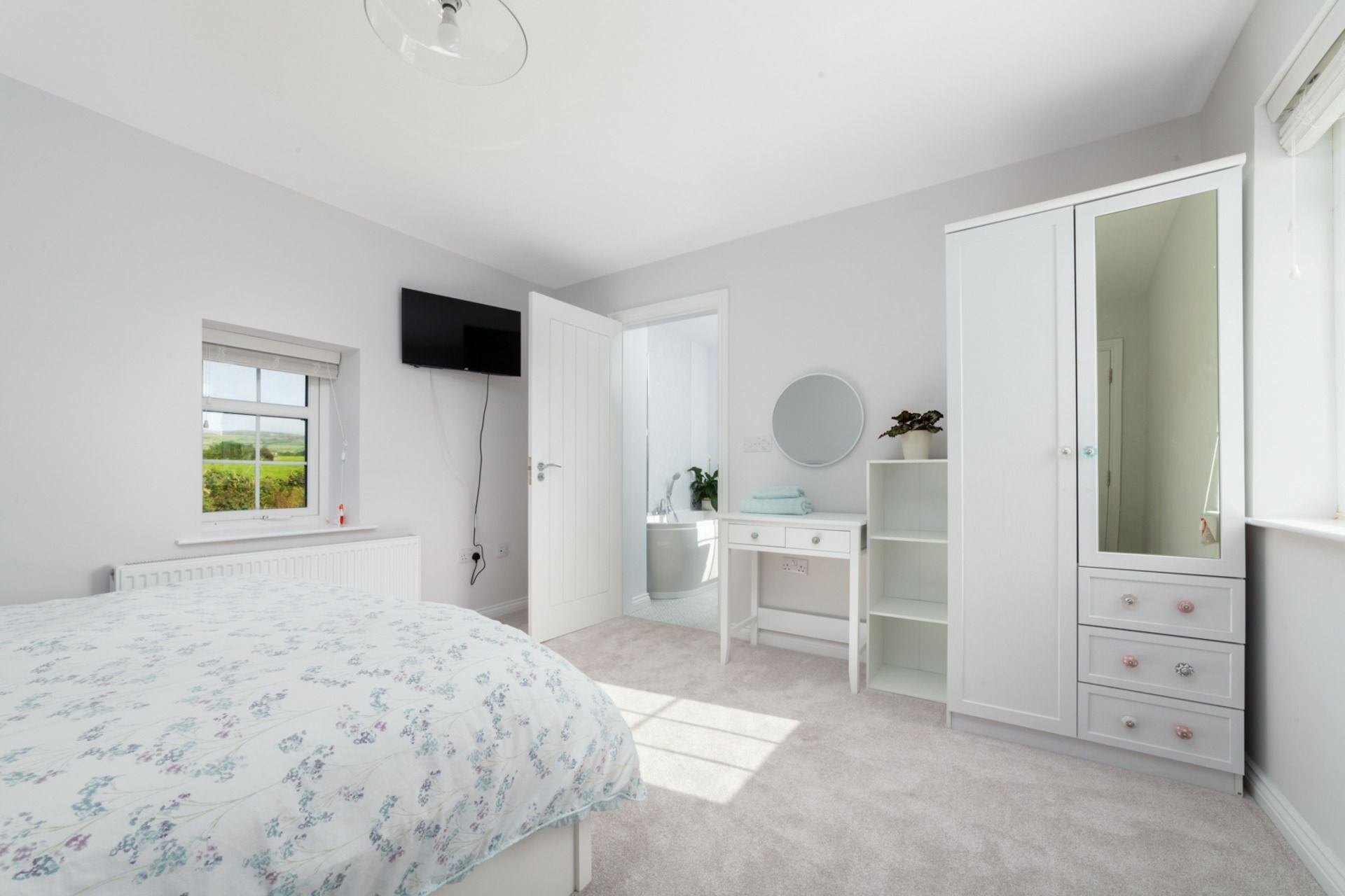 Bedroom 1: King size double bed, wardrobe, bedside tables, dressing table, TV hairdryer, mirror and stool