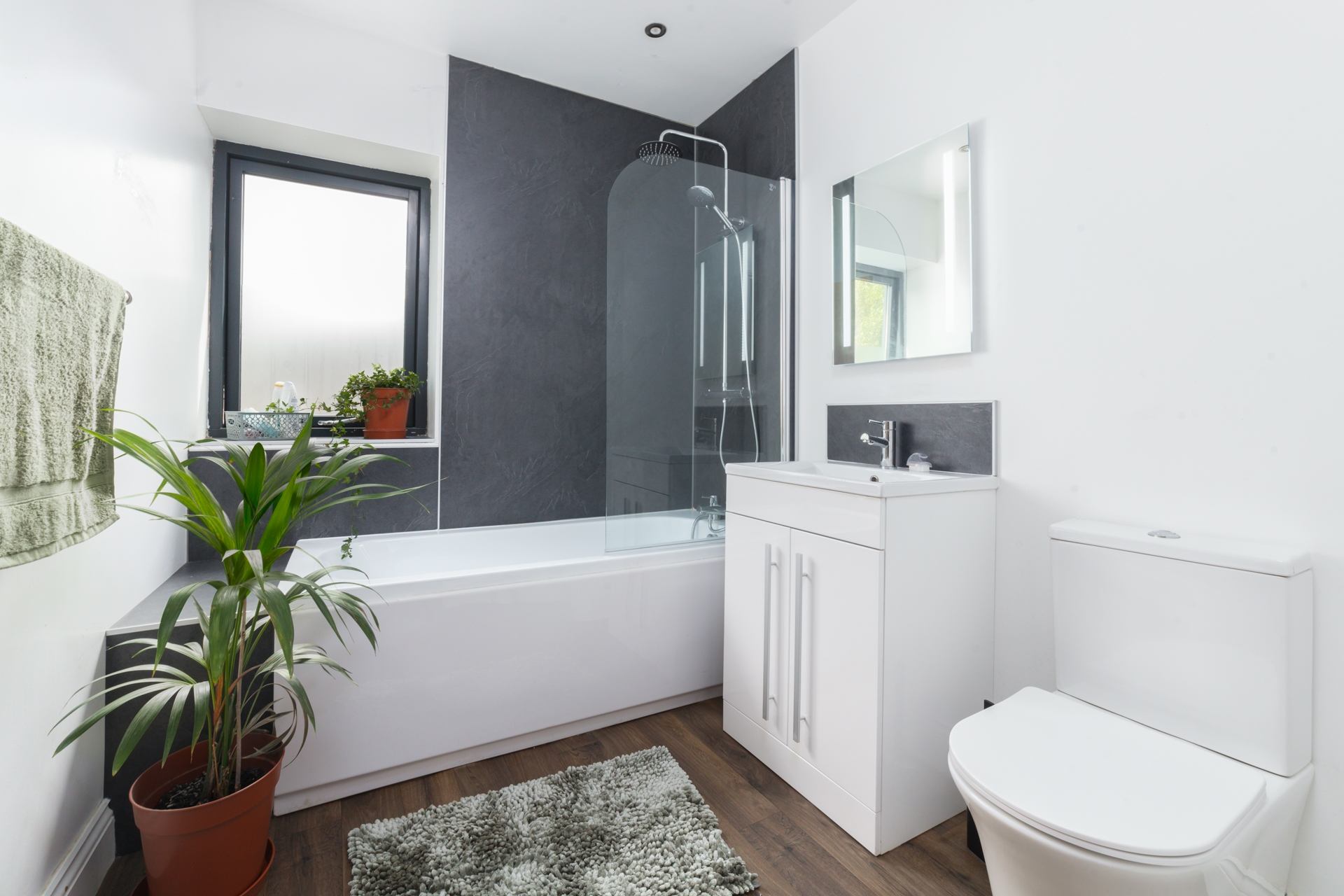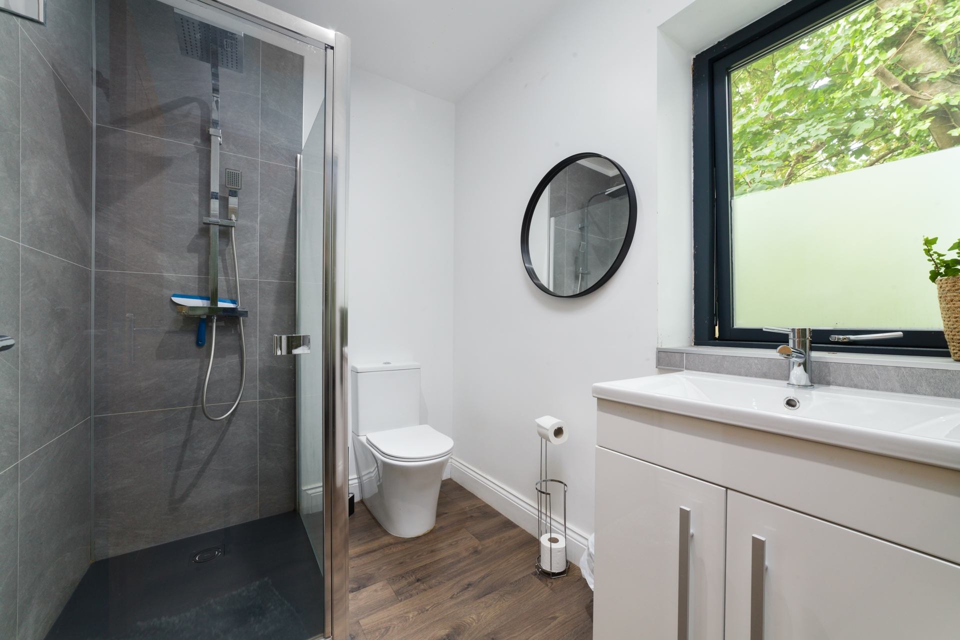 Family Bathroom: Shower over bath, WC and wash hand basin.
