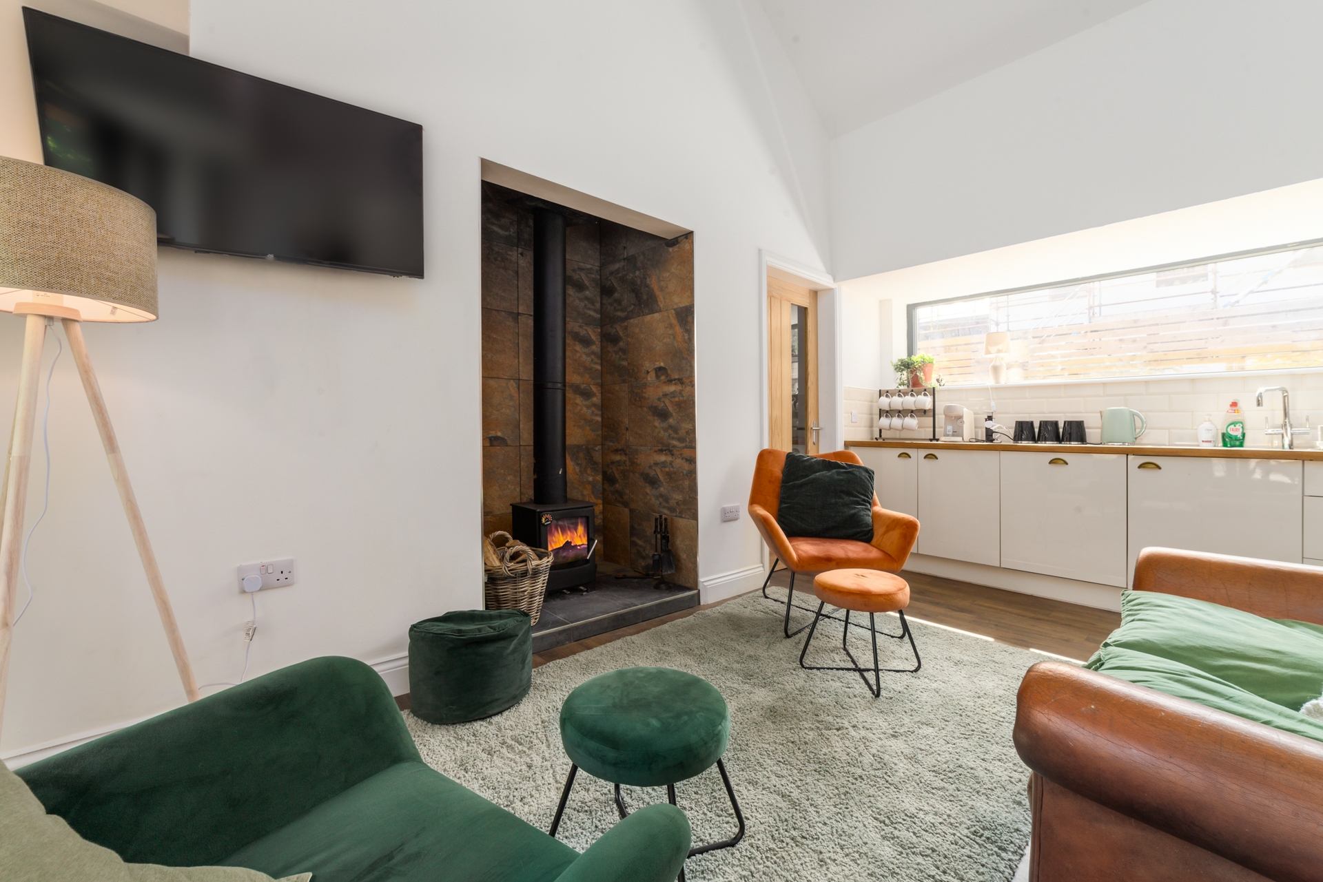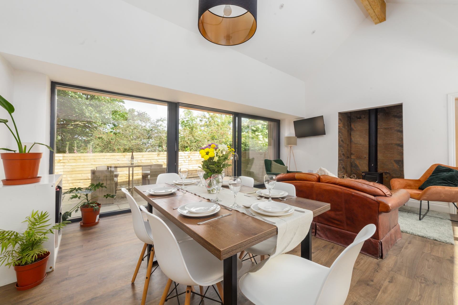 Kitchen, Lounge and Dining Area: Open plan space including well-equipped kitchen containing oven, hob, fridge, freezer, dishwasher. The living area contains a sofa bed and two chair, in addition to the cosy log burner. Dining table and six chairs.