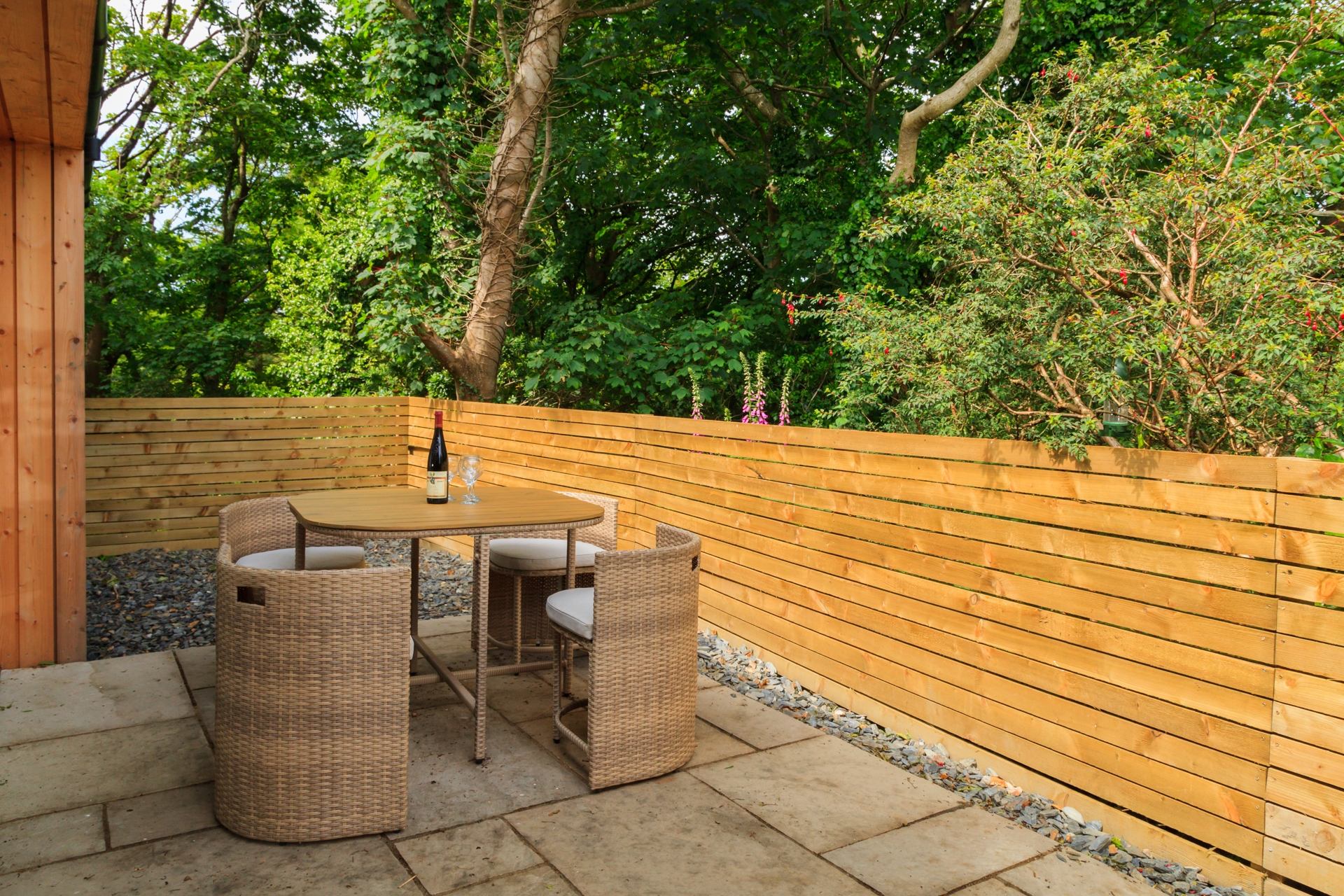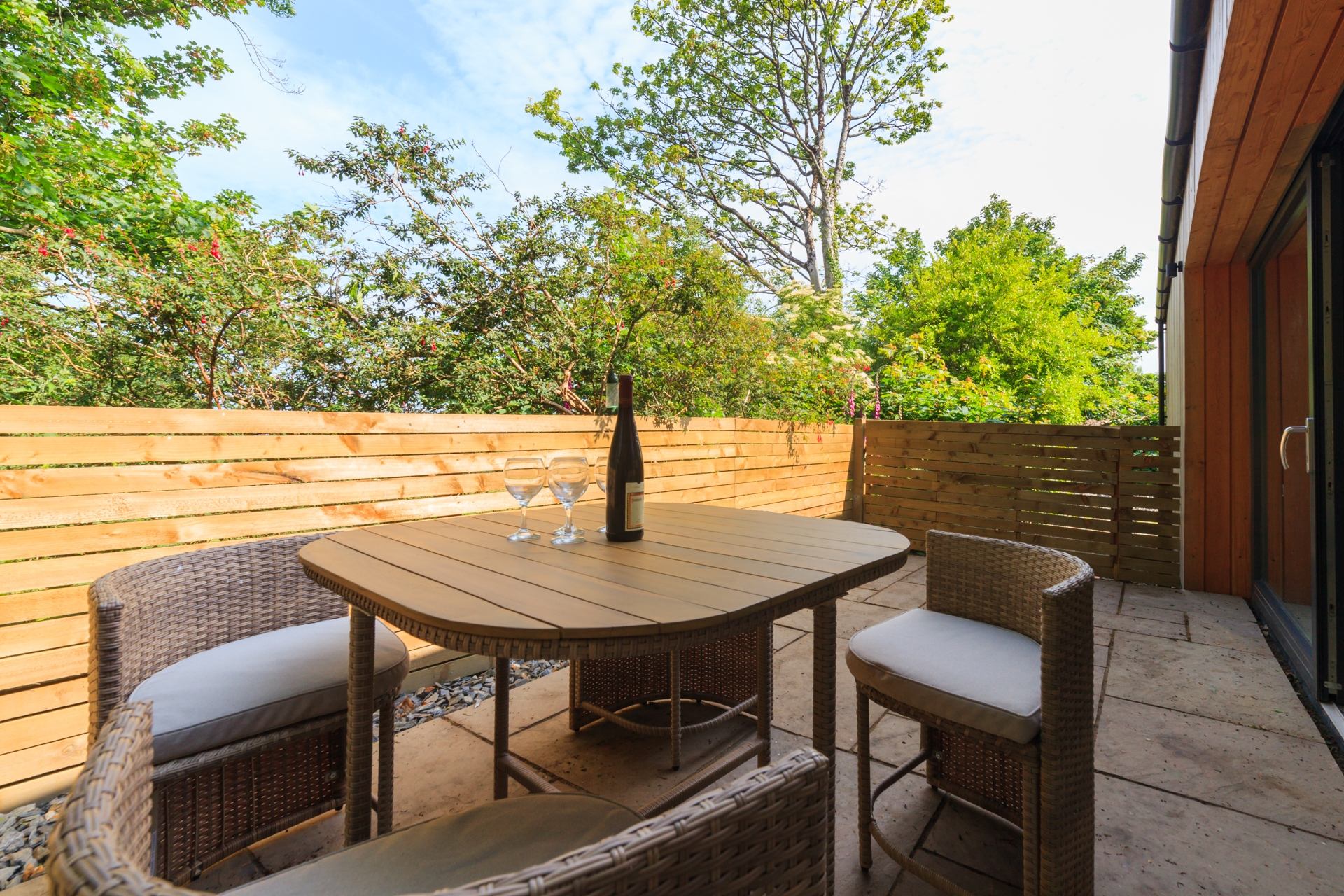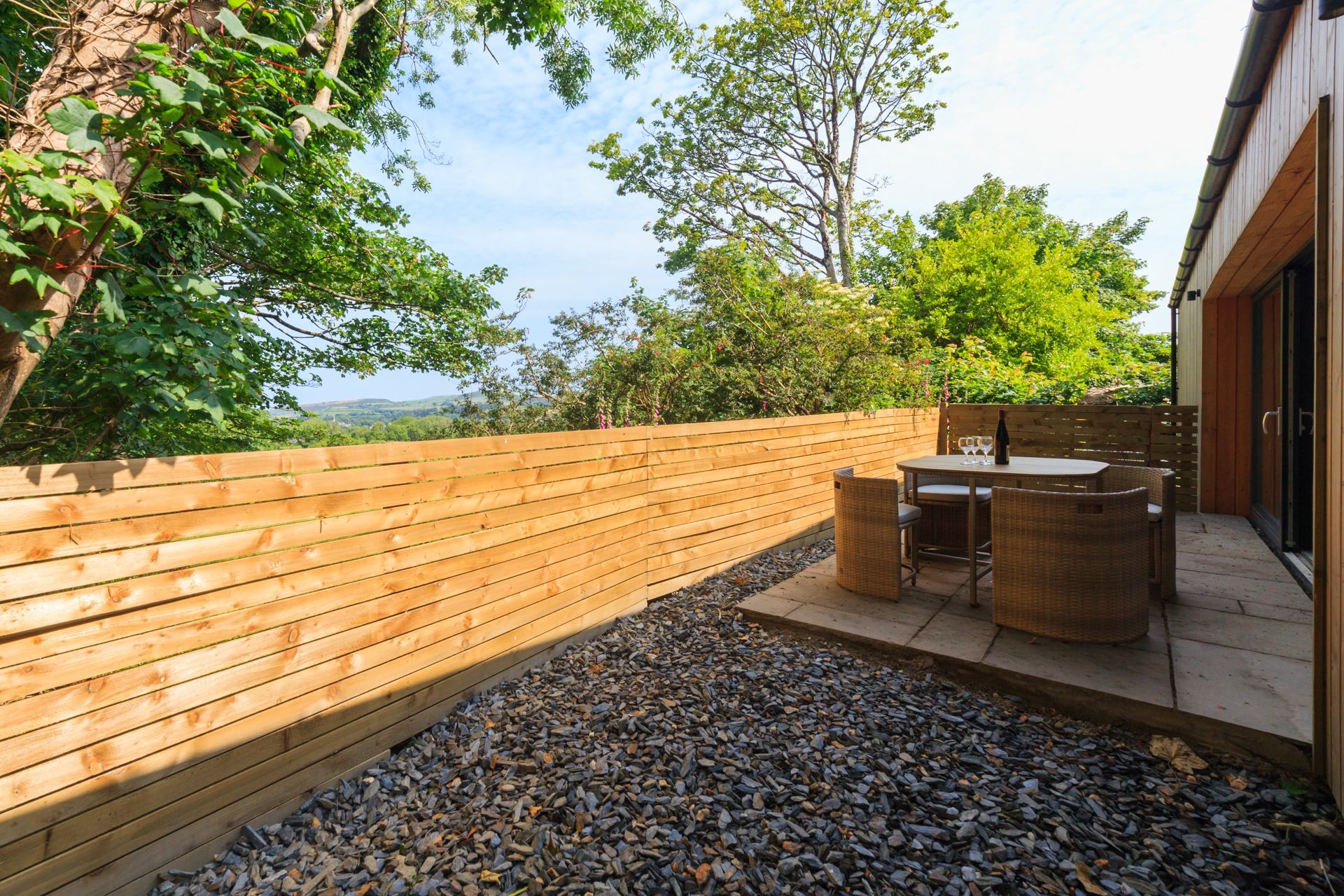 Outdoor patio: Outdoor seating for four people and views over the countryside.