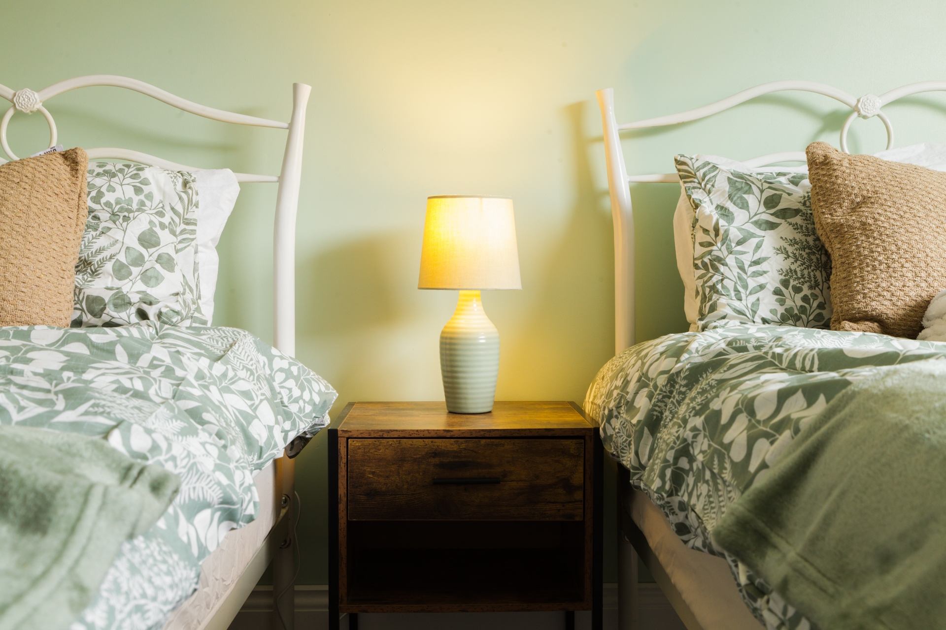 Bedroom 2: Twin beds, bedside table and built-in wardrobe.