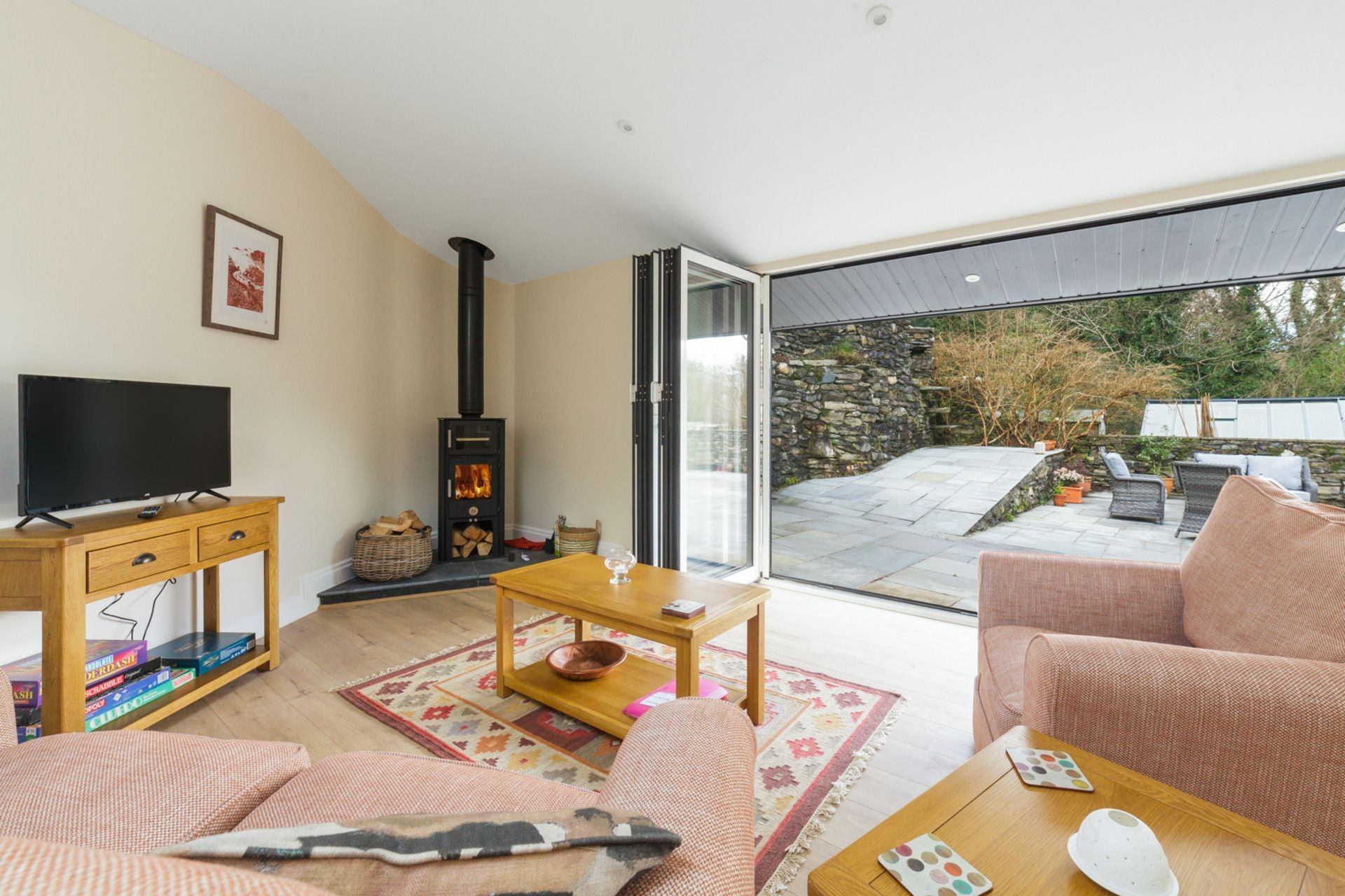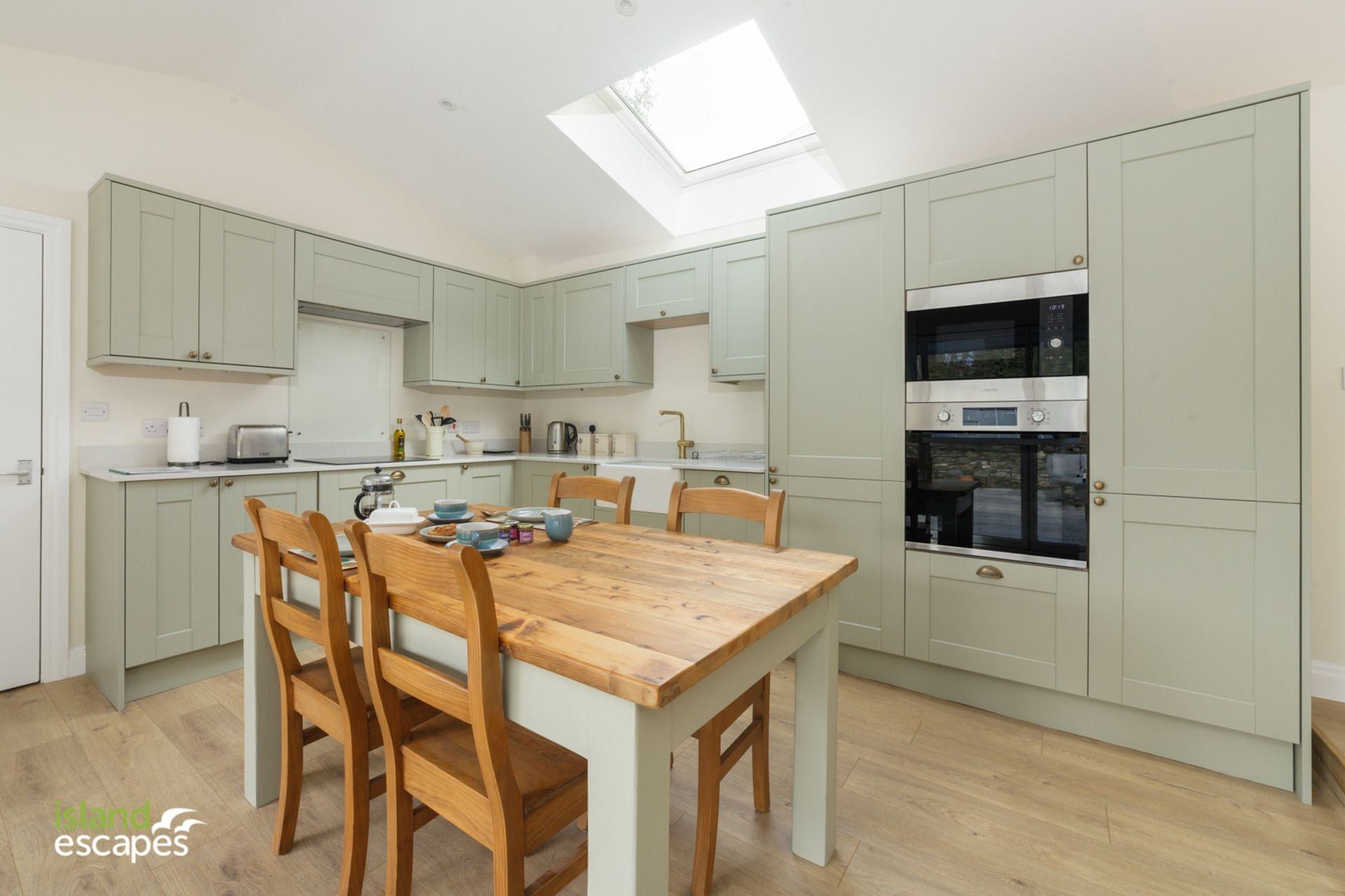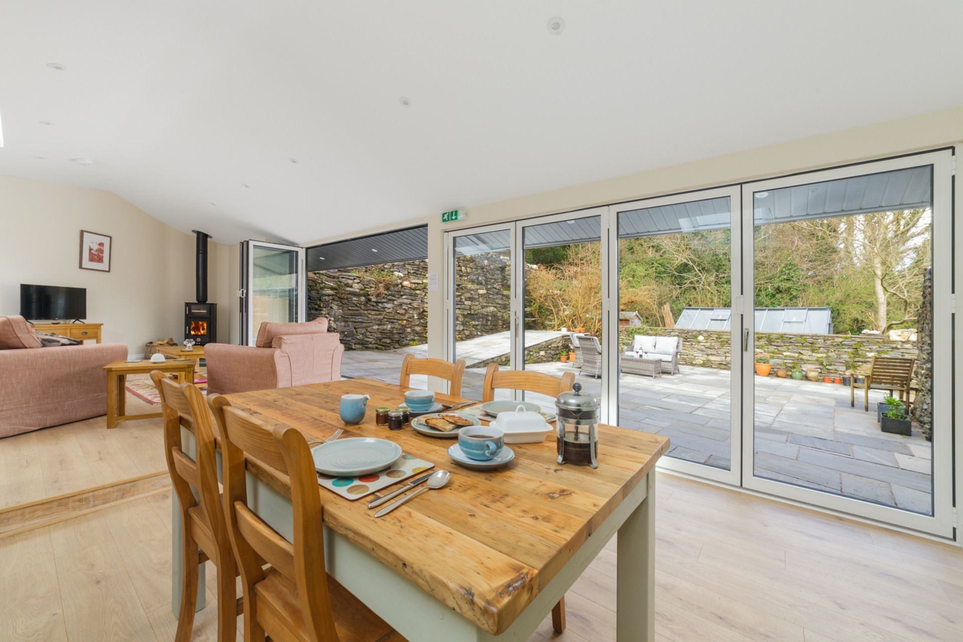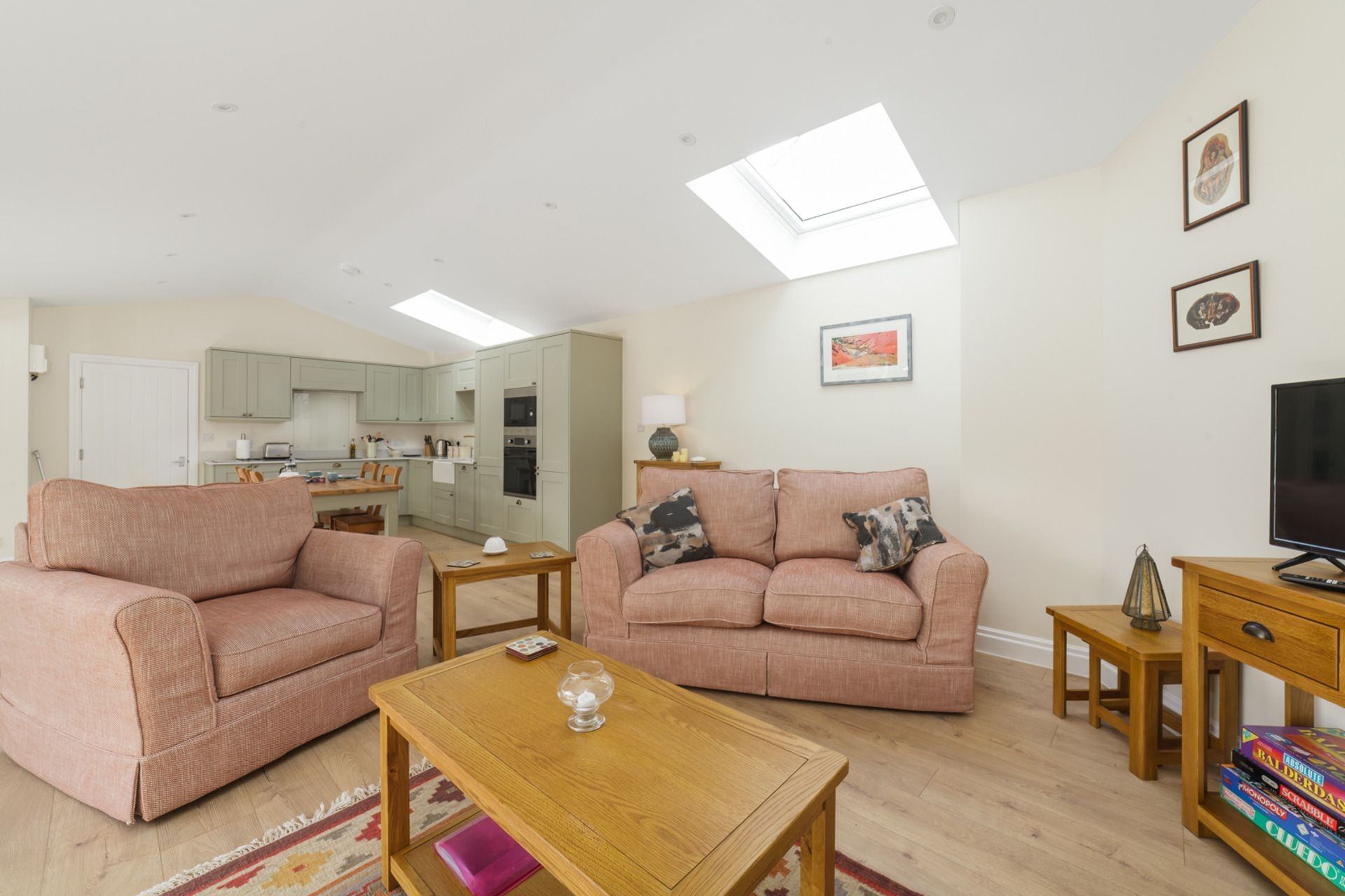 Kitchen & Lounge area: Fully equipped kitchen, comfortable sofa, armchair, TV, log burner, dining table with four chairs