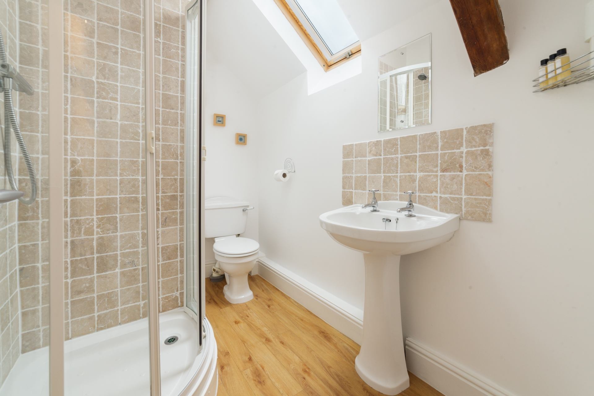 En-suite bathroom: Walk-in shower with rainfall head, WC, heated towel rail and hand wash basin.